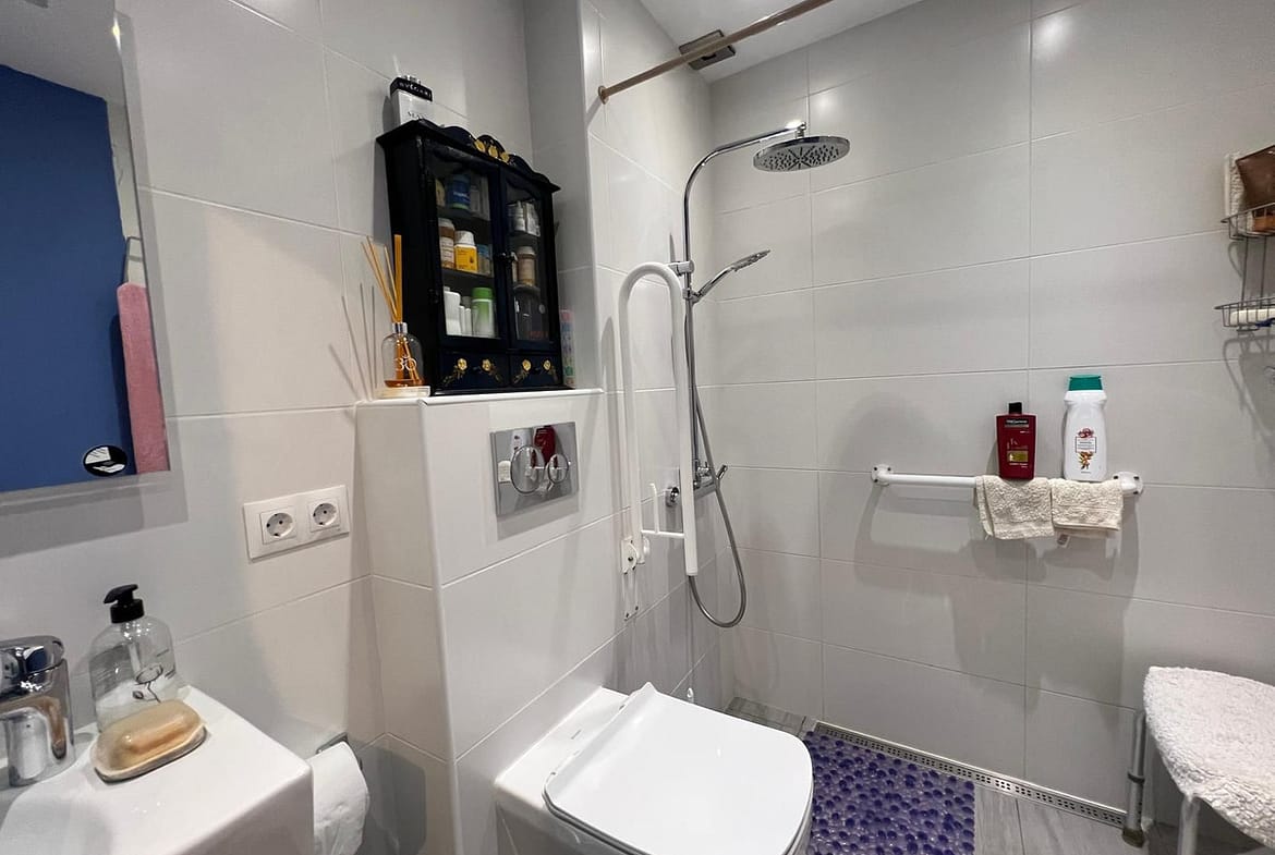 Adapted bathroom with wheelchair accessibility, a room with a built-in wardrobe, renovated bathroom, community pool, close to schools, restaurants, supermarkets, taxi and bus stops.