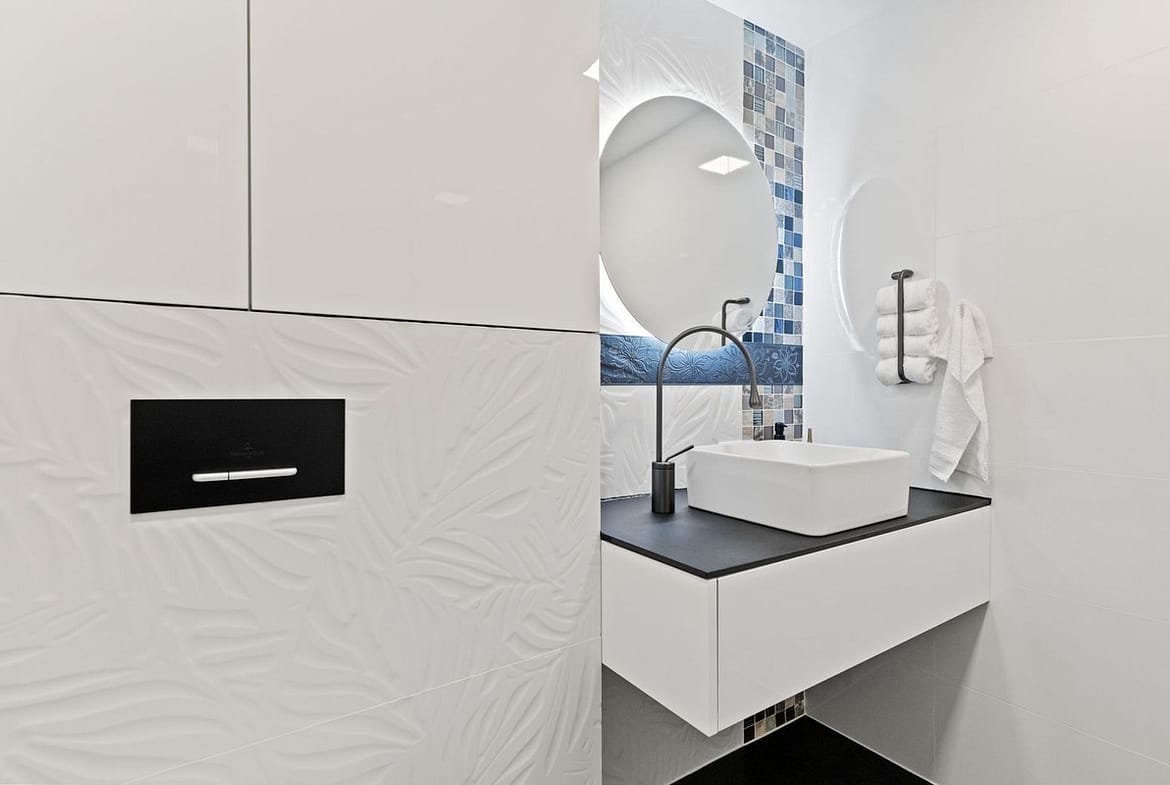 The main bathroom is fitted with premium Villeroy & Boch fixtures and a sleek designer shower, and there’s a separate guest WC for added comfort.