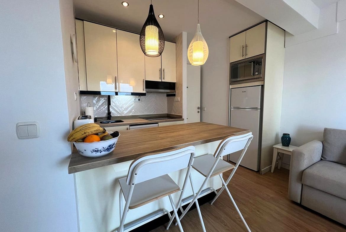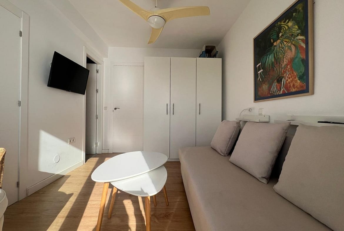 From the very first moment, the apartment conveys a feeling of openness and wellbeing. The bright and welcoming living room opens directly onto the terrace, allowing you to enjoy open sea views and the gentle sea breeze throughout the day. The bedroom, with built-in wardrobe, also benefits from excellent natural light thanks to the corner position of the property, which ensures cross ventilation and brightness in all rooms.