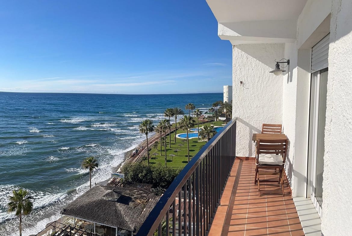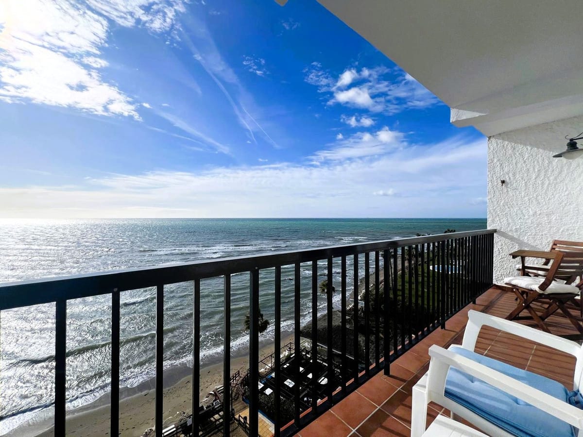Discover a true beachfront gem in Calahonda. This fully renovated corner apartment, located on the front line of the beach, stands out for an exceptional and rarely found feature: a large wraparound terrace that surrounds almost the entire property, creating a unique sense of space, light, and outdoor living with the Mediterranean as its constant backdrop.