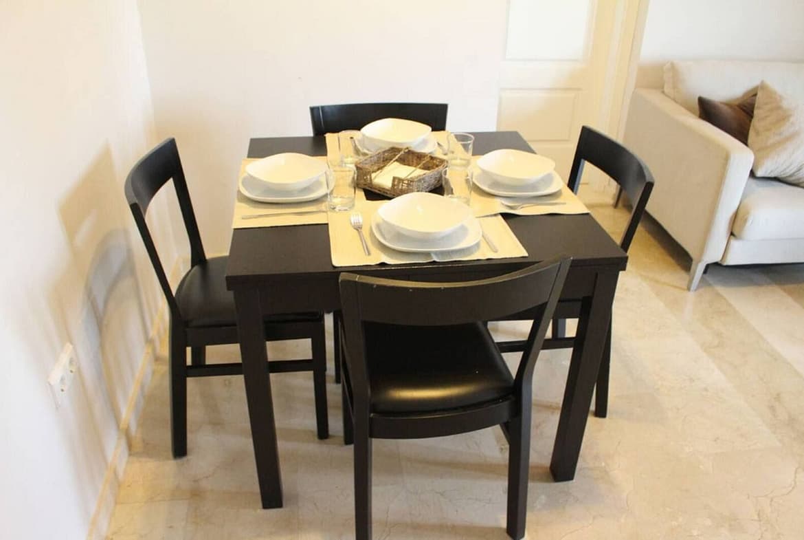 The apartment features a minimalist and comfortable design. It includes a full bathroom with both a shower and bathtub. The separate kitchen not only maximizes space in each area but also offers the opportunity to customize it and make it feel like home from day one. The generous bedroom has ample room to organize your belongings, and the living area easily accommodates a sofa and a dining table for four.