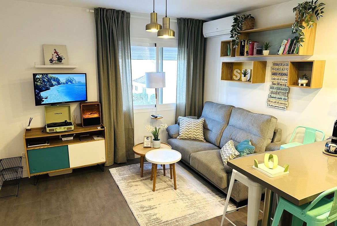 Living room with sofa, TV and Bluetooth/USB record player
