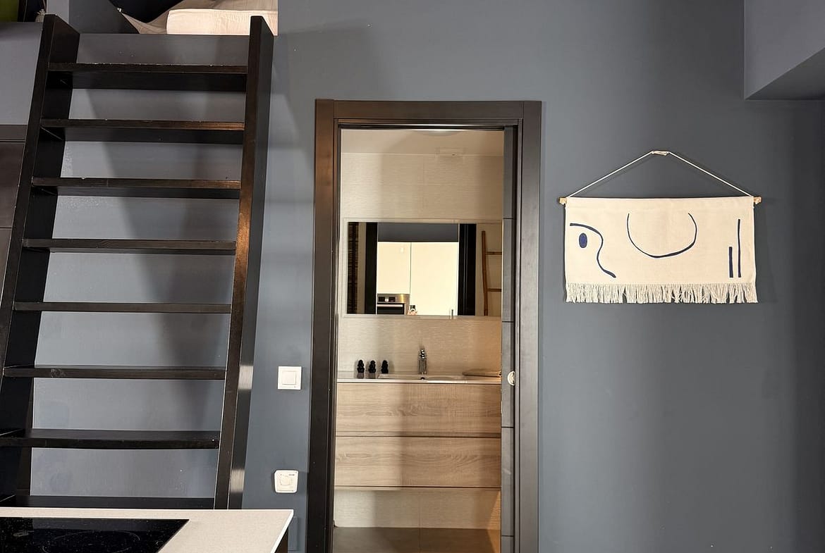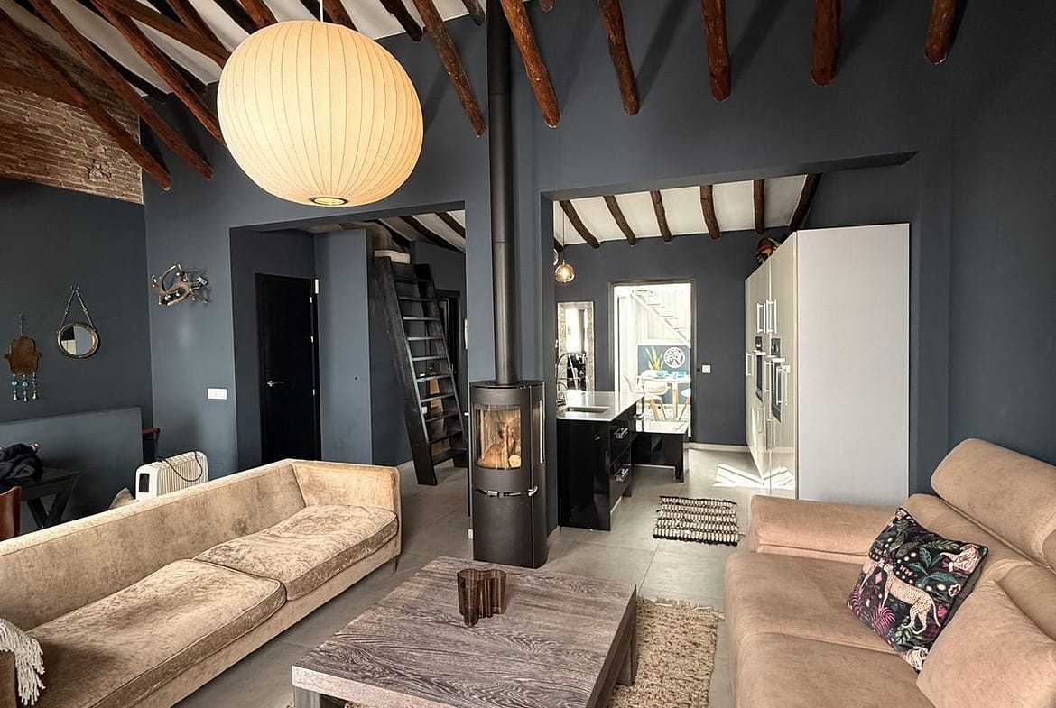 The apartment features an open living concept with dramatic double-height ceilings, original wood beams, and a cozy wood-burning stove. Every detail has been carefully considered in the stunning furnishings and decoration.