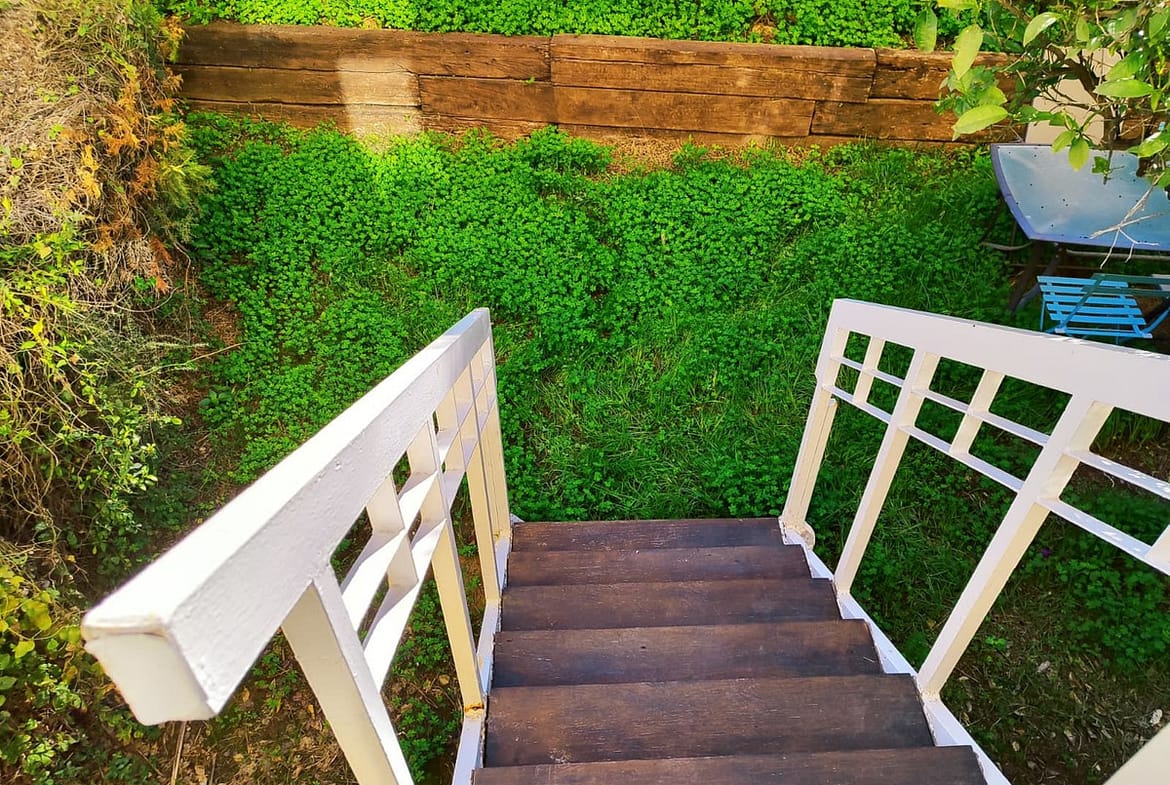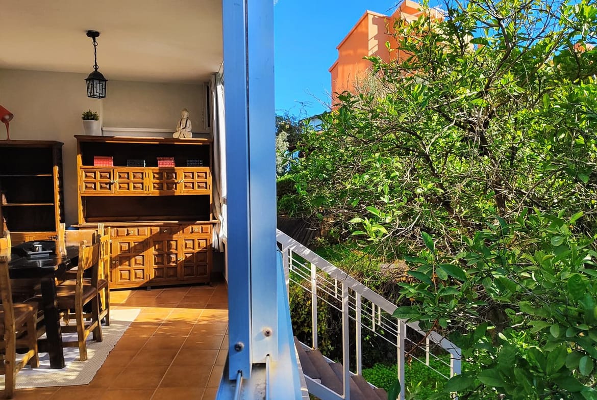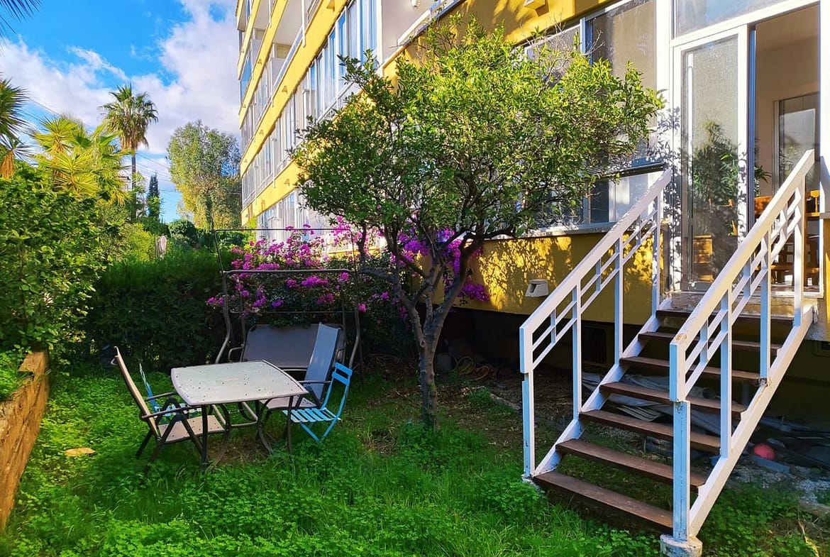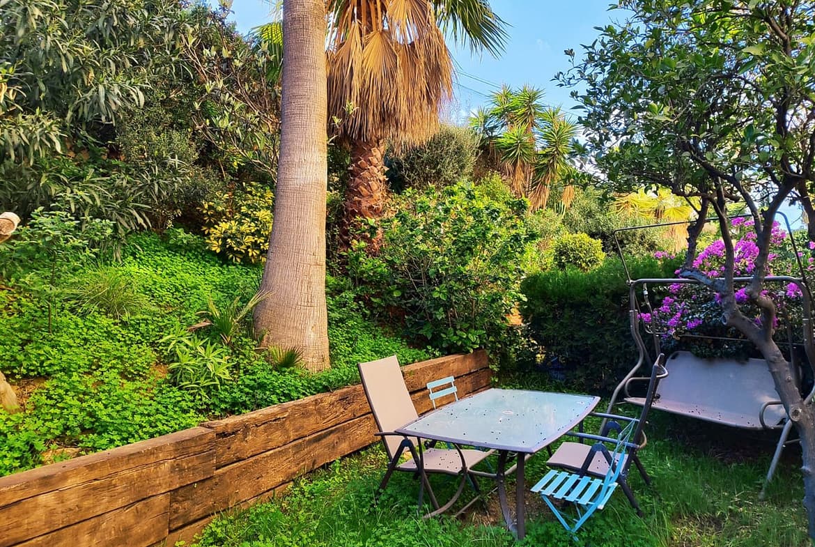 The flat boasts a spacious glazed terrace that opens onto a large private garden with lawn, trees and plants—perfect for enjoying outdoor living. The open-plan kitchen comes fully equipped with a washing machine and integrates seamlessly with the generous living–dining area, creating a warm and functional space. The bedroom includes built-in wardrobes providing plenty of storage, and the full bathroom is ready for immediate use.