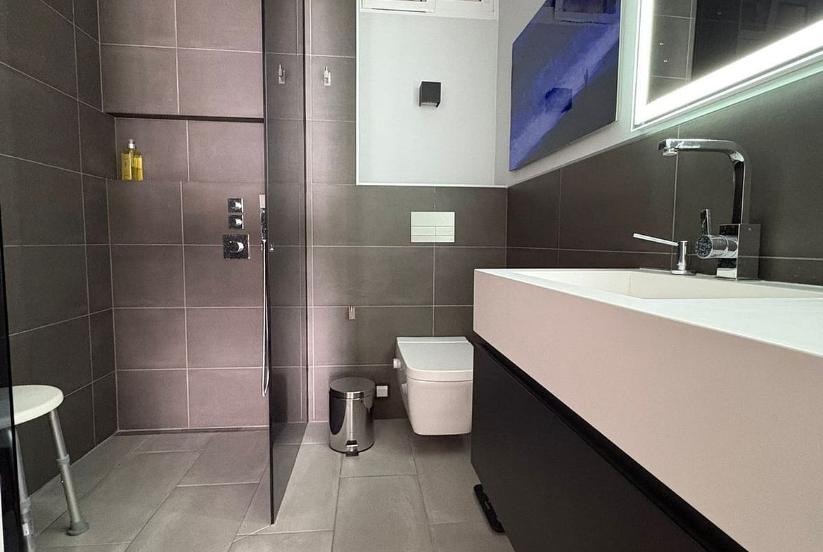 spacious entrance hall with direct sea views, a new and modern kitchen with its own window, bathroom with shower and a small window.