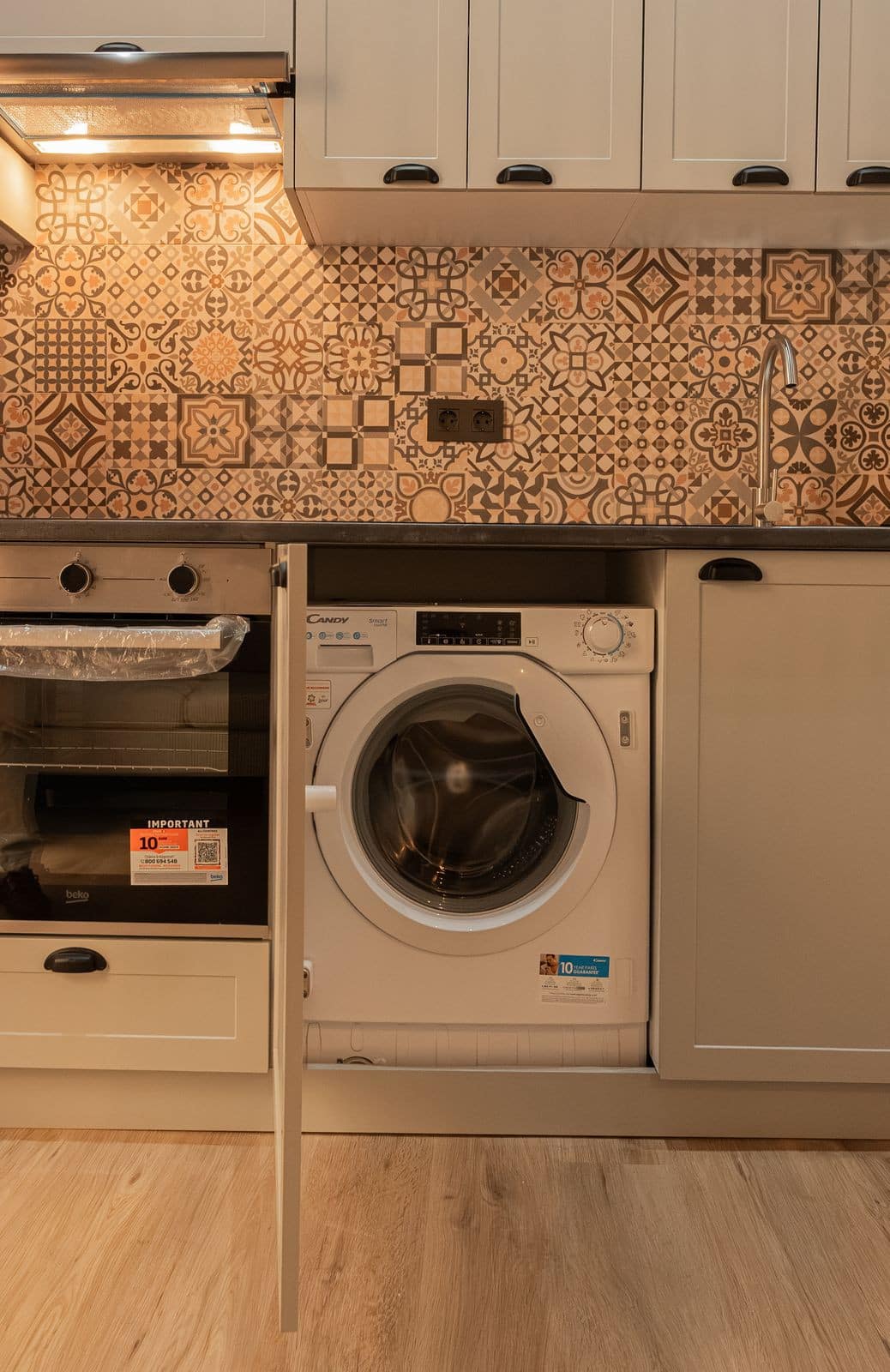 The brand-new kitchen has been custom-designed for this property and includes a range hood, ceramic hob, oven, washer-dryer, and built-in refrigerator — all brand new, unused, and included in the price. The living room and bedroom furniture are also new and unused.