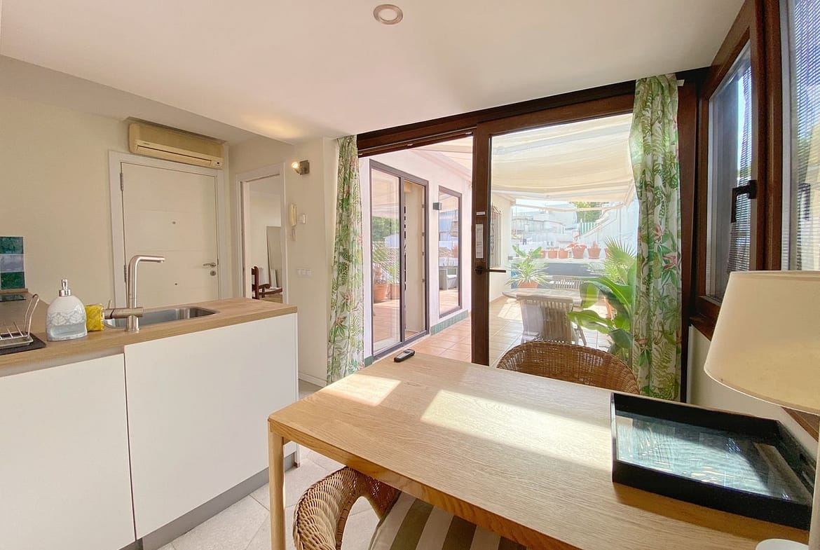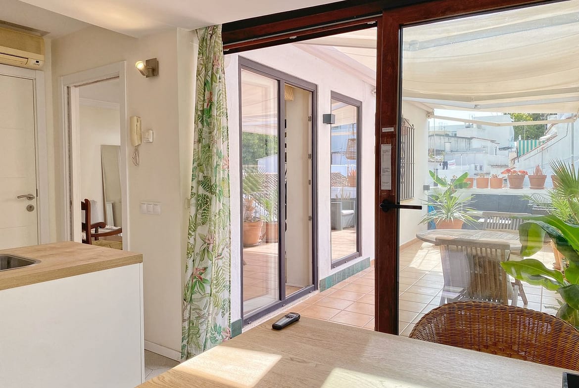 Located on a quiet pedestrian street in Marbella's Old Town, very peaceful and quiet. The apartment has a separate bedroom, a bathroom with a shower and an exterior window, a cozy living room, and a fully equipped kitchen with a dining area, both with direct access to a fantastic outdoor terrace of aprox. 25 sqm, where there are different areas to relax or sunbathe on the sun lounger, or to sit and eat outside.