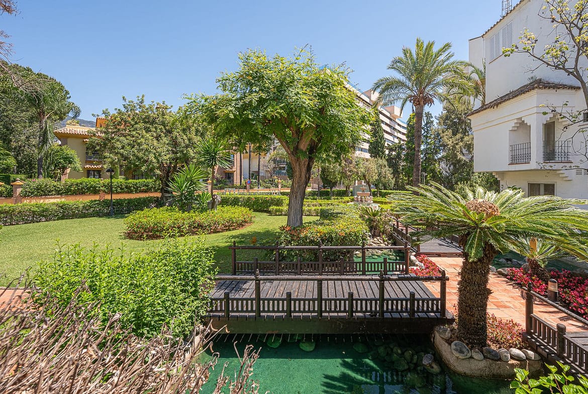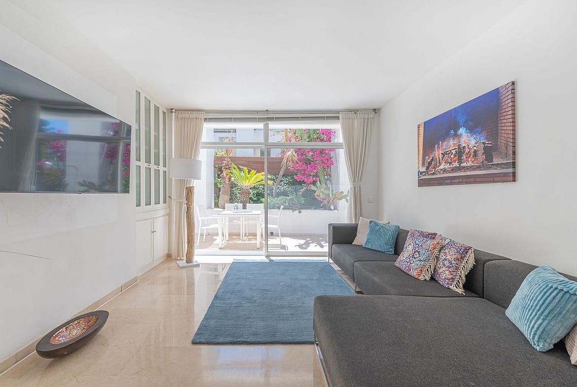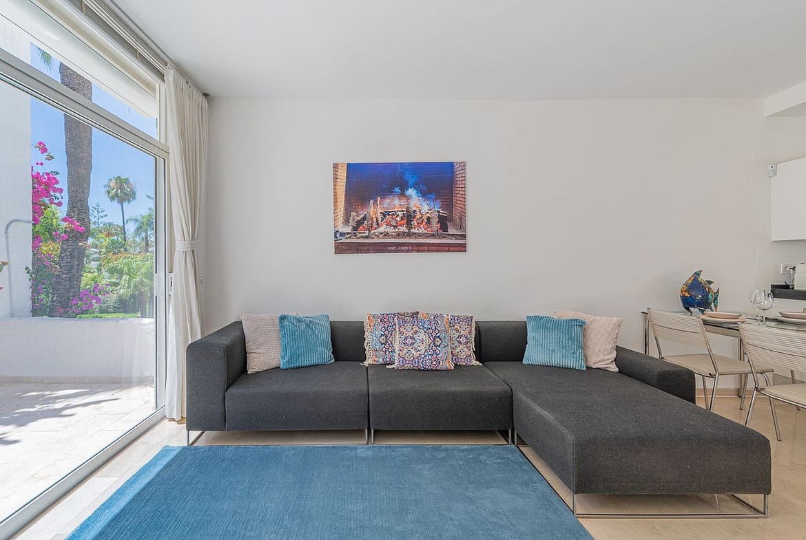Beautiful one bedroom apartment in Alhambra del Mar on the Golden Mile of Marbella only 100m from the beach promenade and close to all amenities. The apartment consists of a spacious living-dining space with open American kitchen and direct access to a nice terrace with lovely views to the tropical garden of the complex. Furthermore there is a good size bedroom with bathroom and a small dressing area en suite. It is surrounded by the lush gardens and fountains of the Alhambra del Mar urbanization which evoke a permanent feeling of holidays and breathing space. With all amenities at hand and just a few metres from the beach, Capuccino and at walking distance to Marbella centre, the apartment offers an excellent location and a rare opportunity to live by the sea. Includes a good sized storage in the basement.