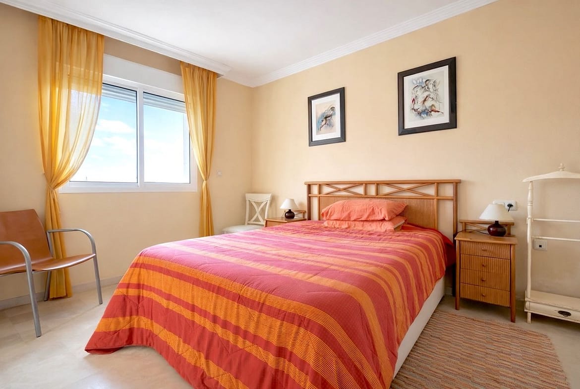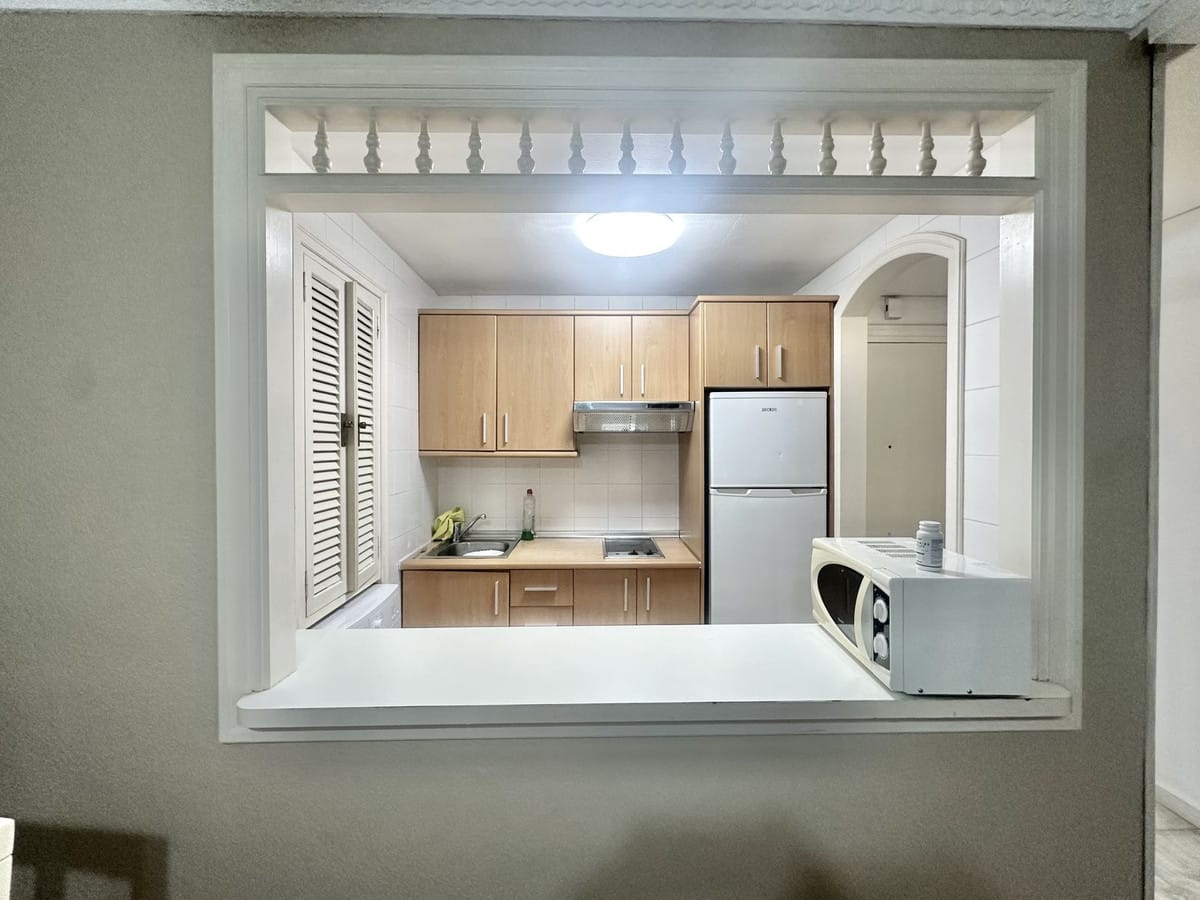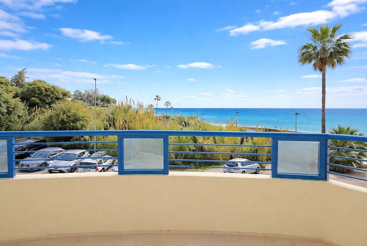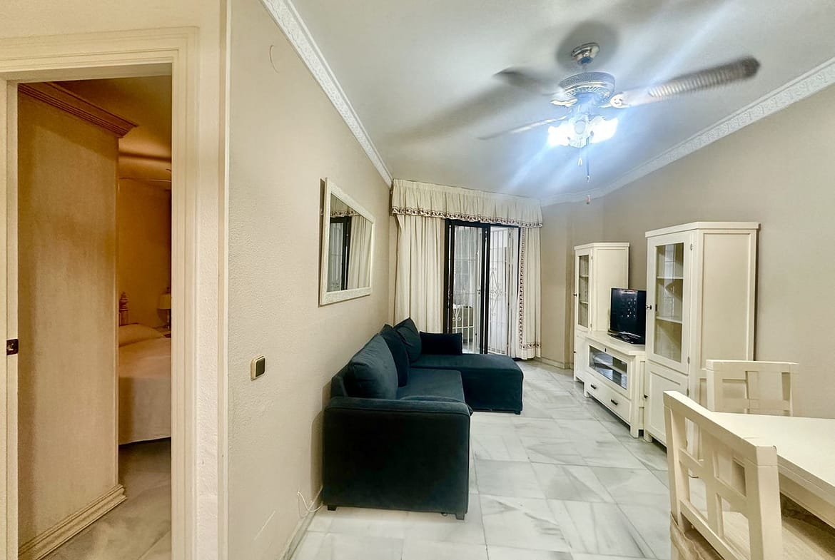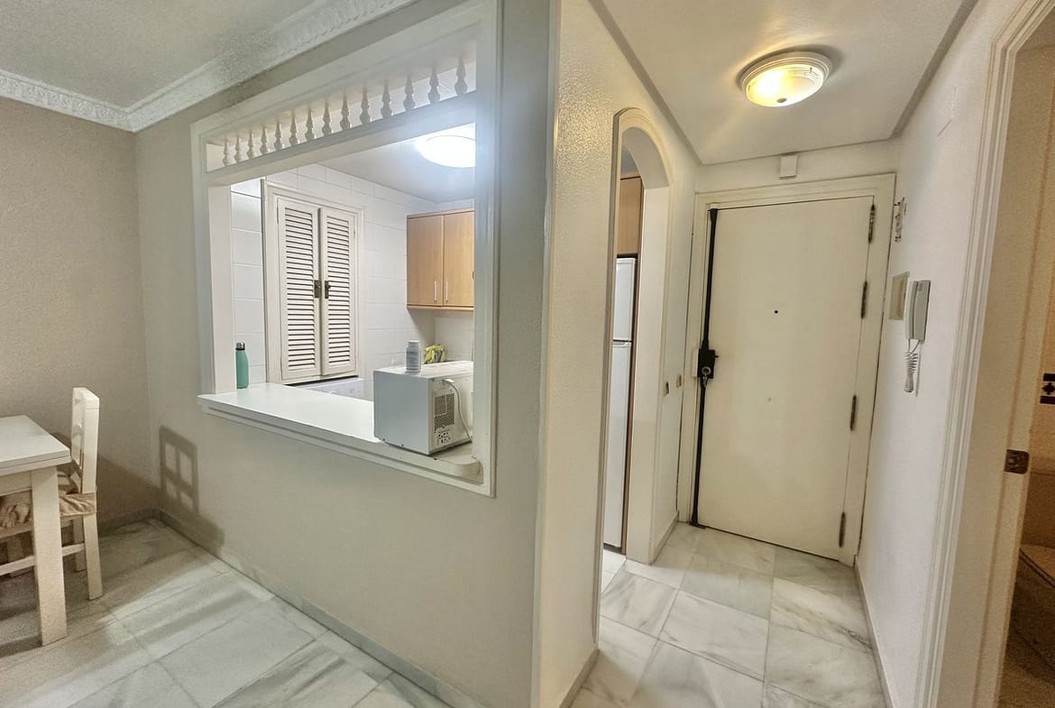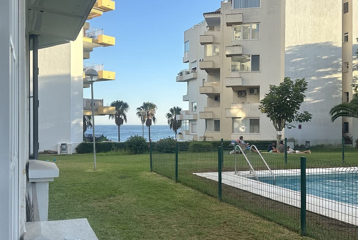 Nice apartment on the beachfront in Marbella. It has 57 m2, 1 bedroom (built-in wardrobes), 1 bathroom, open-plan kitchen (furnished and with appliances), laundry room, living-dining room, and terrace (sea views). Good condition. Furnished, air conditioning throughout the apartment, alarm system. Gated community with swimming pool, gardens, and communal terraces. Located at the entrance to Marbella, close to shops and the city center. 1st floor (very high for a 1st floor). Beach about 30 meters away.