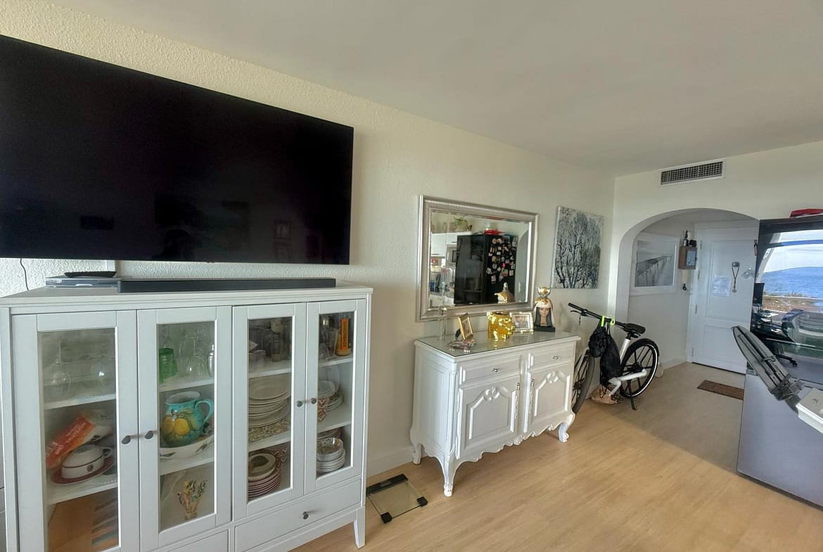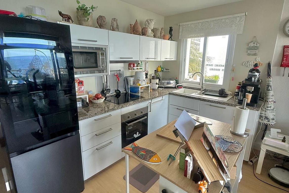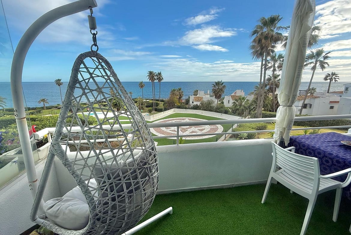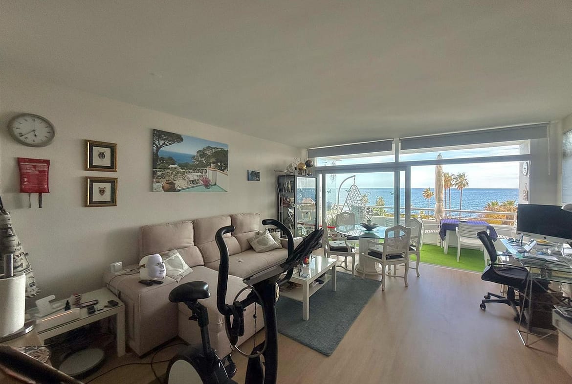 Wake up to breathtaking, uninterrupted views of the sea from this stunning frontline beach apartment. Designed with an open-plan layout, the interior seamlessly connects the living space with the kitchen and terrace, creating a bright and airy ambiance. The terrace offers the perfect setting for outdoor dining while enjoying the spectacular coastal scenery.