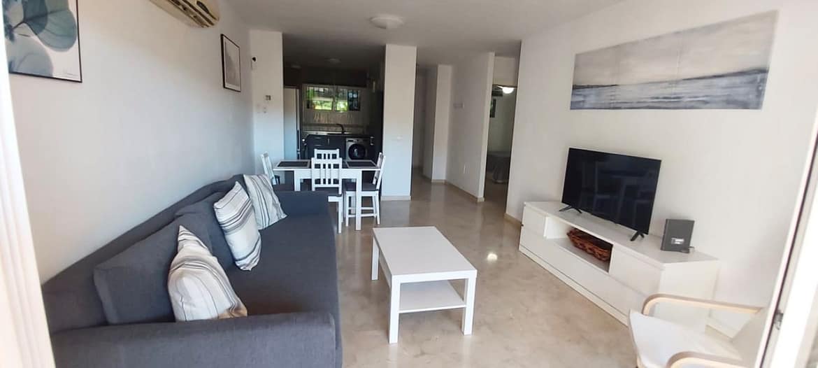 Beautiful elevated ground-floor apartment in the quiet residential community, Valle Tropical, Riviera del Sol, made up of only 24 apartments. With a lovely south-west facing terrace overlooking a lovely green area, this spacious property comprises a hallway with a fitted wardrobe, a lounge/dining room, a fully fitted modern kitchen, a double bedroom with fitted wardrobes, and a bathroom. In addition, accessed via staircase or lift, is an underground carparking space. The apartment is sold fully furnished and has hot and cold air conditioning. The community is immaculately maintained and has a large garden and swimming pool area.