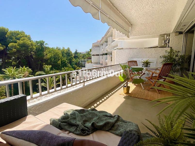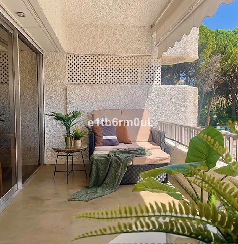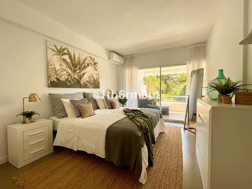 This elegant one-bedroom south facing apartment is situated in a prime location, beachside and within a three-minute walk to the beach on the highly sought-after Marbella Golden Mile, an easy walking distance to the shops, town centre, and port, and restaurants The apartment forms part of a gated community, ensuring privacy and security with 24-hour concierge service. The apartment features a bright airy living space with a fully fitted modern kitchen. The large, spacious light-filled bedroom with wardrobes offers a calm and inviting retreat. Contemporary shower room with sleek walk-in enclosure with floating vanity unit and storage. For added convenience and privacy there is a separate toilet. Climate control is taken care of with hot and cold air conditioning, ensuring year round comfort. The spacious balcony includes a storage area and sun blinds for those warm sunny days. The community areas include a well-maintained garden, two swimming pools, and secure communal parking.