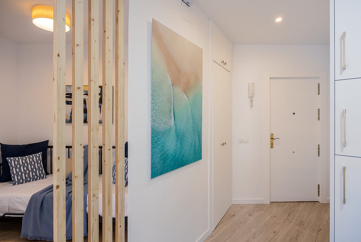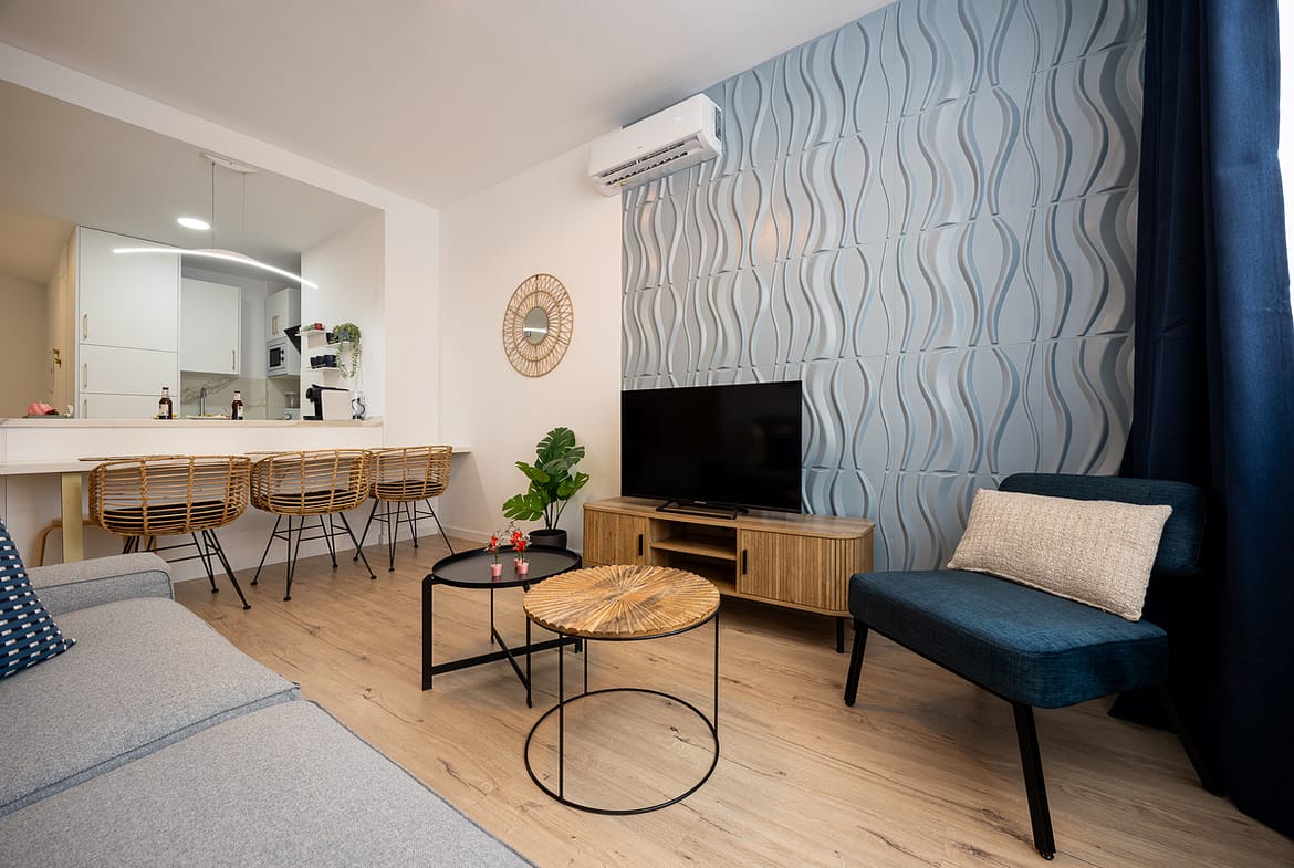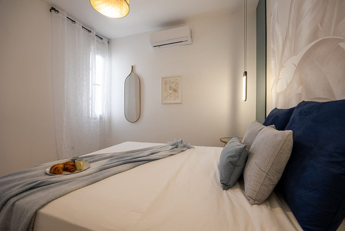 Our flat has one bedroom, a living room with an open-plan kitchen separated by a beautiful island that doubles as a dining table, air conditioning and a south-facing aspect that provides it with a special light, making it cosy and functional.