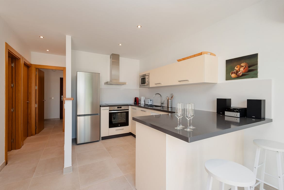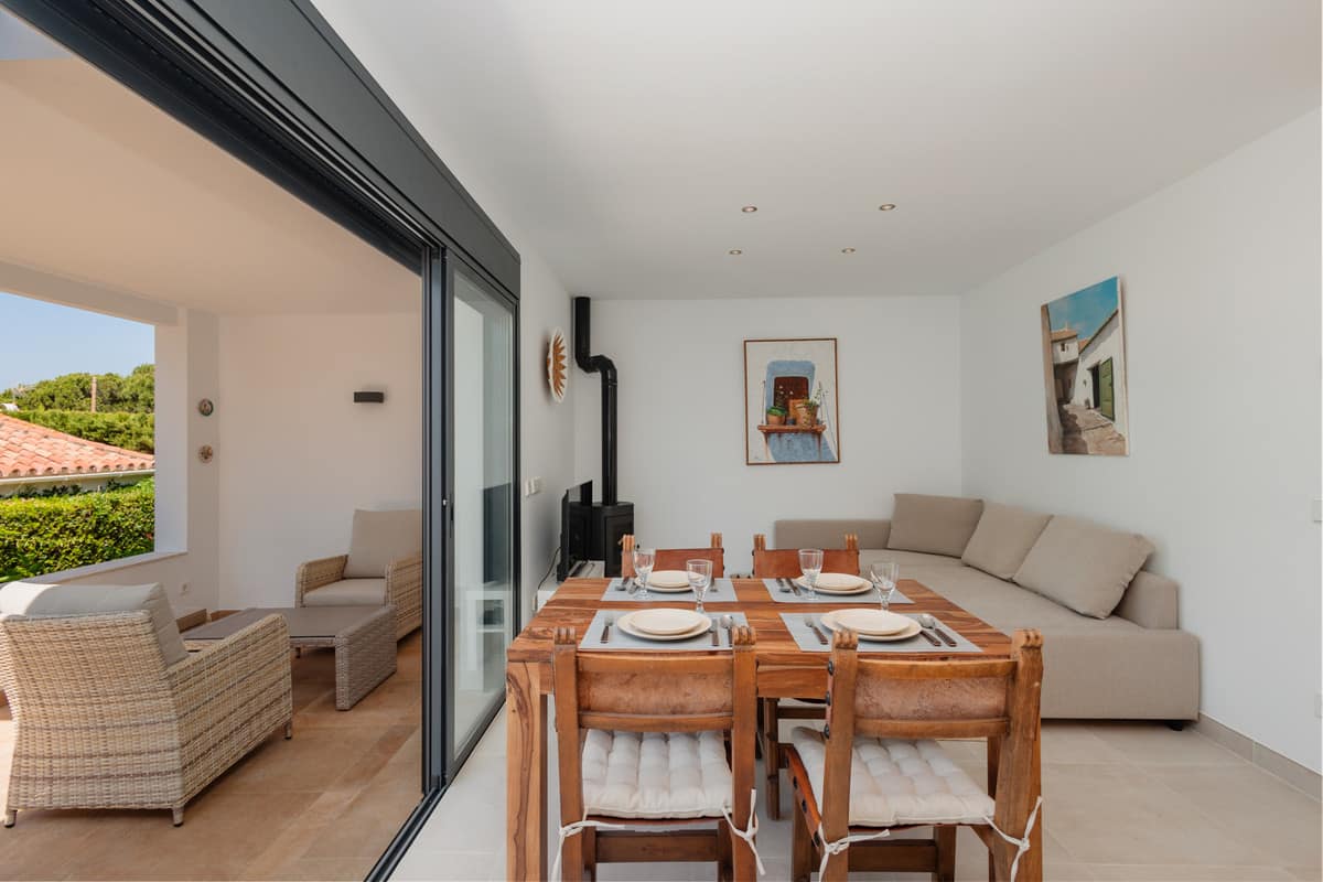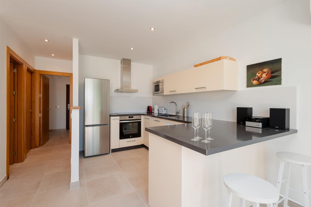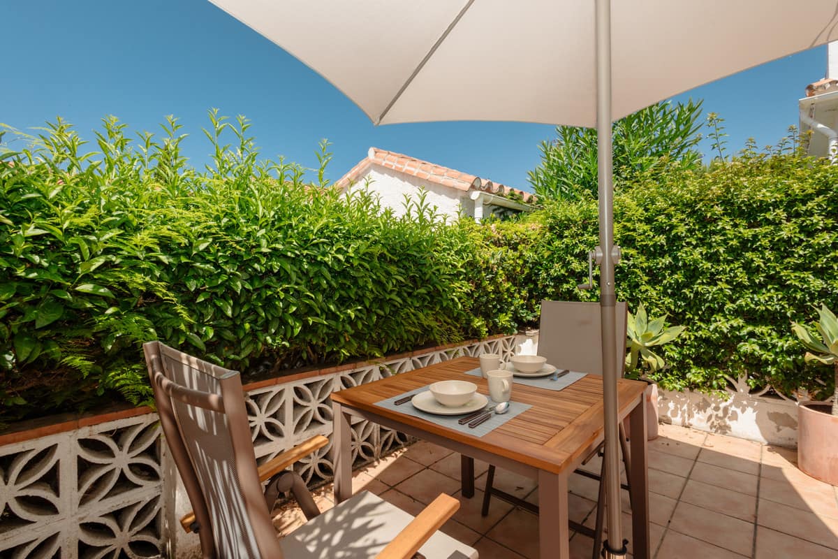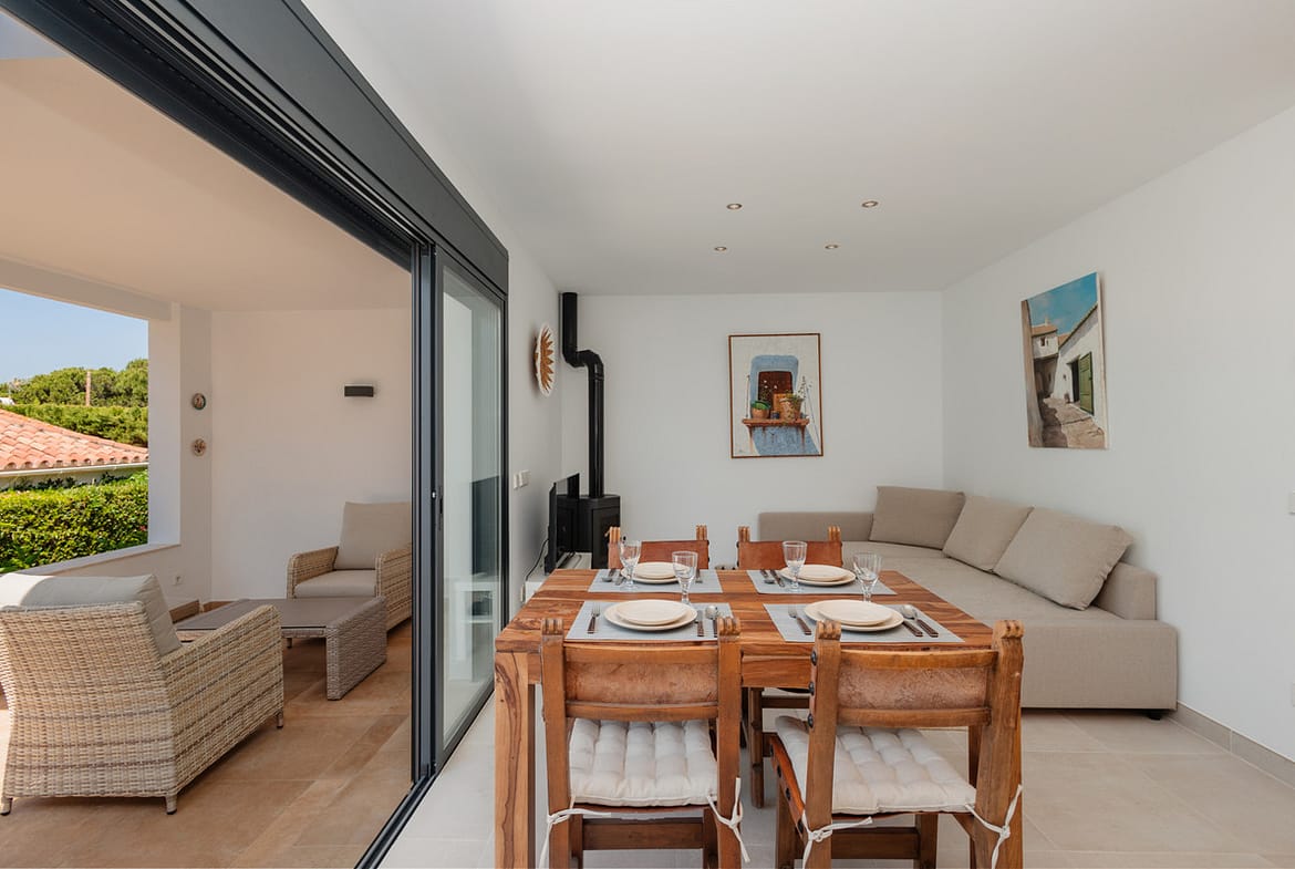 The American style kitchen is fully equipped with modern appliances such as oven, microwave, refrigerator, coffee maker, toaster and kettle. You will also find all the necessary kitchen utensils to prepare delicious meals. From the living-dining room, you will have access to a covered terrace with a cozy chill-out area, perfect for relaxing and enjoying the outdoors. It also has a second larger and sunny terrace with an outdoor dining table for 2 people.