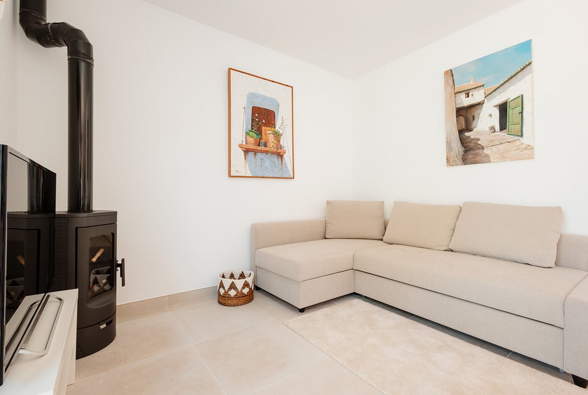 Upon entering the house, you will be greeted by a spacious living-dining room, stylishly decorated and equipped with everything you will need during your stay. The living room has a comfortable sofa and a television for your entertainment. In addition, there is a wood-burning stove to keep you warm on cooler days. The dining room has a spacious table with seating for six people, ideal for enjoying meals with your loved ones.