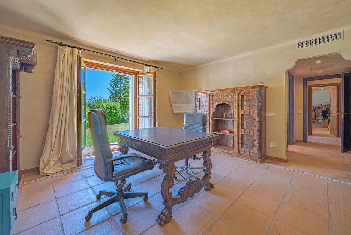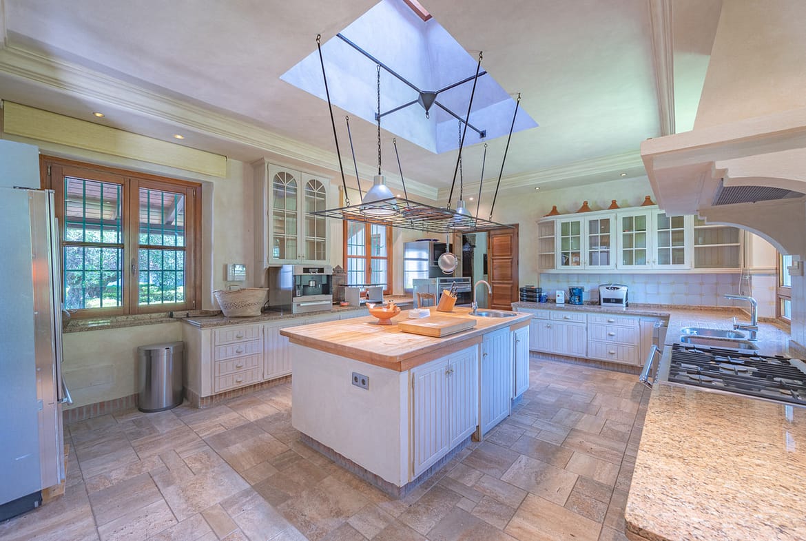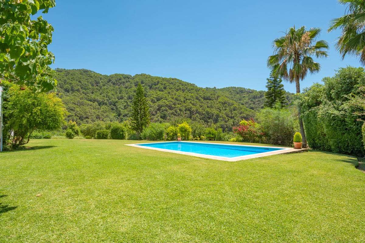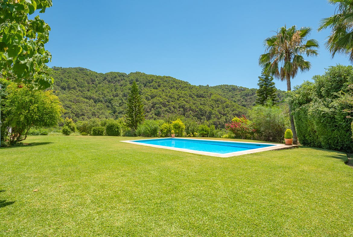 Lovely ten bedroom, south facing country style villa in El Velerin, Estepona, with a large private garden and swimming pool. The property has a large entrance hall; cosy living area with a fireplace and high ceilings; dining room; fully fitted kitchen with island; the master suite; and nine guest suites. There is also a Spa with Jacuzzi and a Gym. Other features include parking for six cars, hot and cold air conditioning and central heating.
