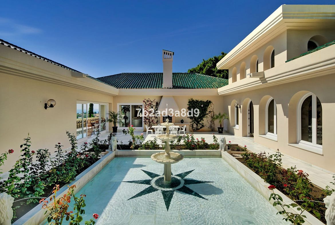 The property currently features ten bedrooms and ten bathrooms arranged within a timeless layout, complemented by multiple lounges, expansive terraces, and a pavilion ideal for wellness, entertaining, or a retreat-style bar. The main house includes a traditional central patio with a fountain, generous living and dining areas, and suites with direct access to the terraces and pool. A separate two-storey guest house offers additional bedrooms, lounges, and kitchen facilities, making it perfect for extended family or visitors. The estate further benefits from a four-car garage, beautifully landscaped gardens, and an impressive pool area designed to capture the spectacular sea and golf views.