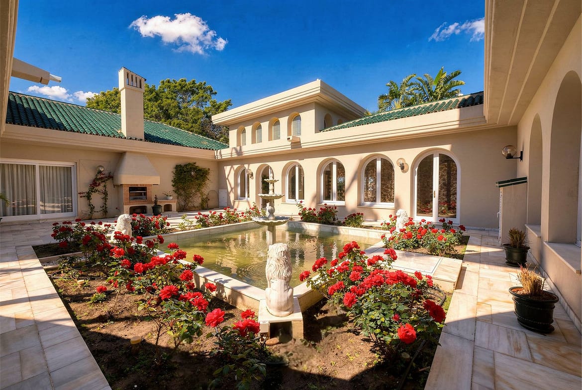 • Main House (Ground Floor): Expansive living and dining areas, central patio with fountain, multiple suites, and access to terraces and pool.