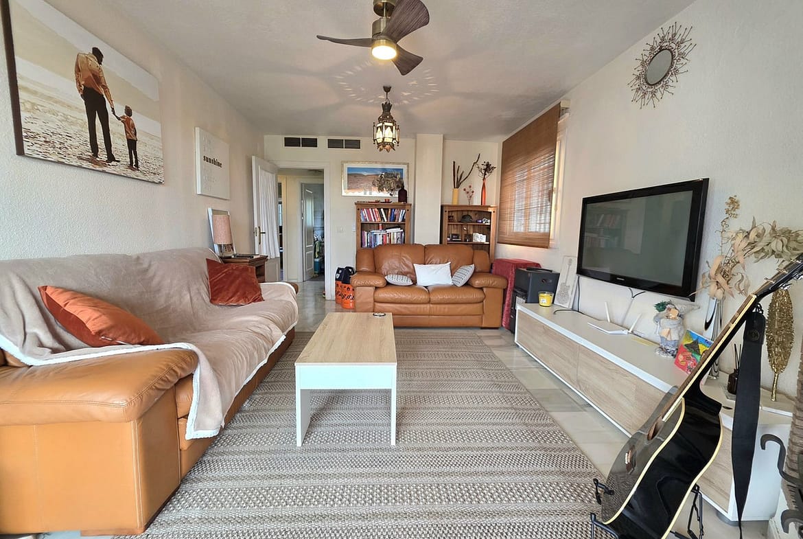 This bargain apartment is located in the highly sought after area of Aloha, Nueva Andalucia, close to schools, golf and amenities. Having a south facing orientation allows this first floor apartment to offer beautiful open views across the golf valley and coastline. This property is well laid out. On entering you are greeted by a hallway with a fully fitted kitchen on the right and a bright sitting room on the left that flows onto the large covered terrace. Being a corner apartment the sitting room has extra windows and plenty of natural light. Both bedrooms are large with built in wardrobes and the master bedroom has A/C. The urbanisation is located at the end of a cul de sac and has a lovely communal swimming pool with sunbeds and gardens. This property is sold with an underground parking space and a storage room.