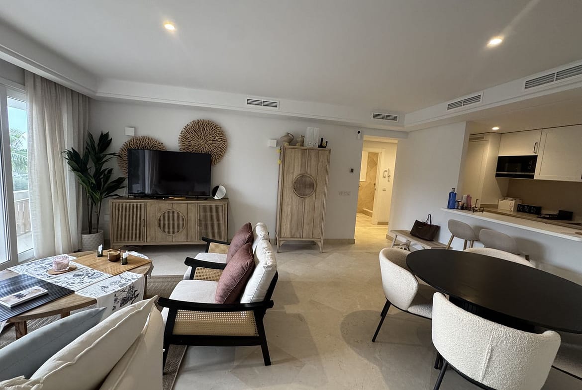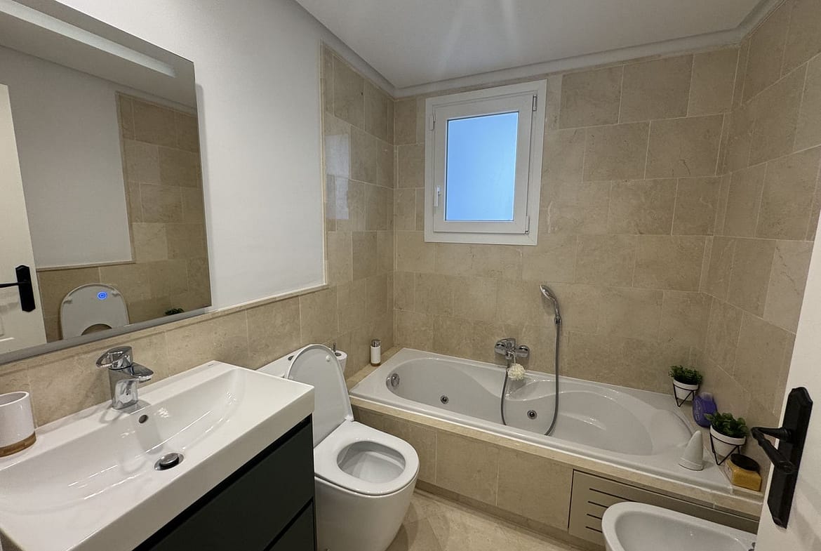 Beautiful, new, modern, fully furnished apartment with sea and mountain views for sale. Two spacious bedrooms, 2 bathrooms, sunny living room. All rooms have access to a spacious terrace (37m) facing south-east. A good parking space and storage room are included in the price. The complex has a modern gym, swimming pool, beautiful garden and security.