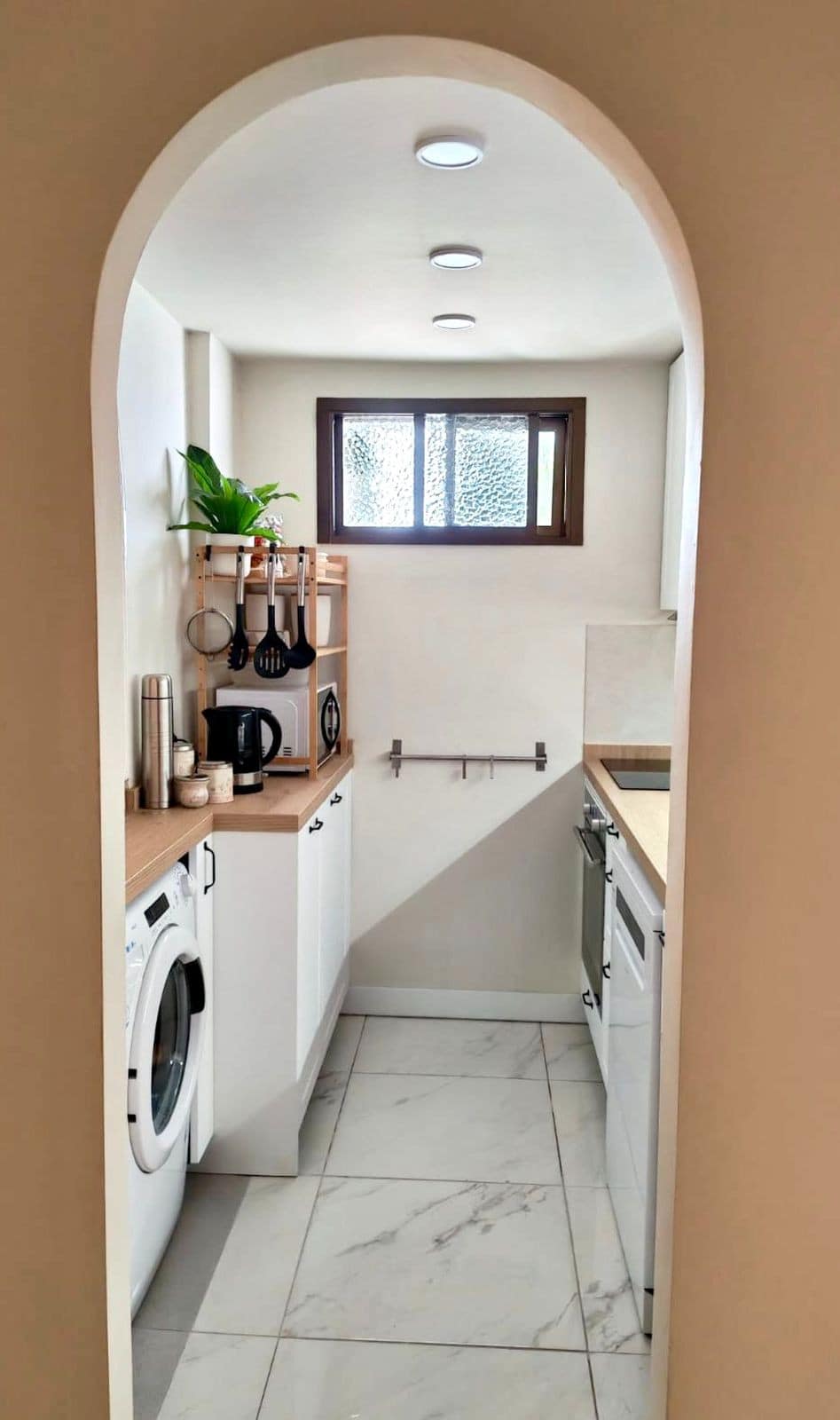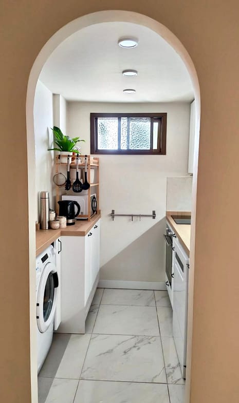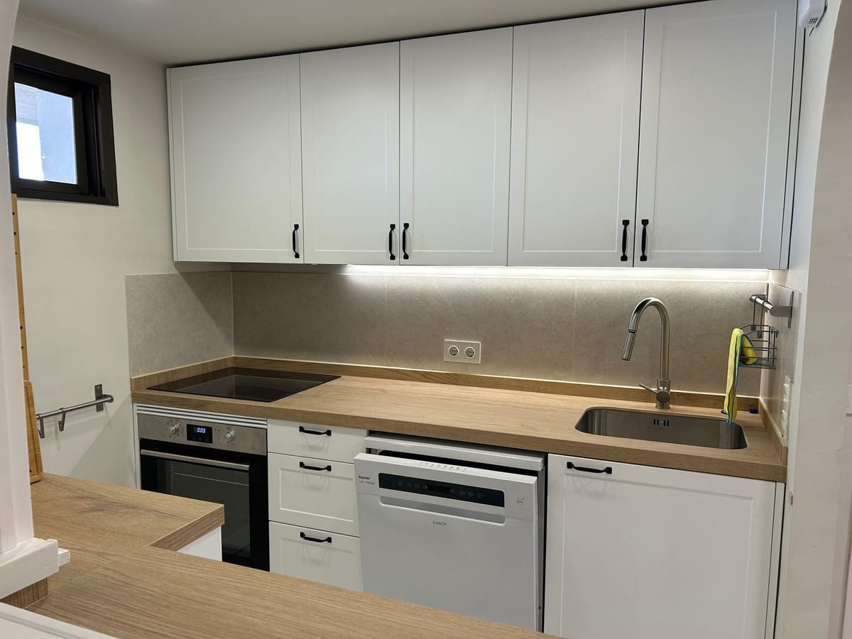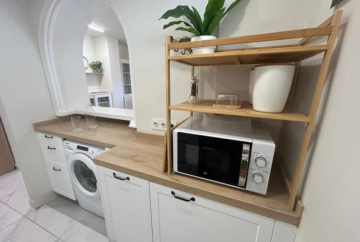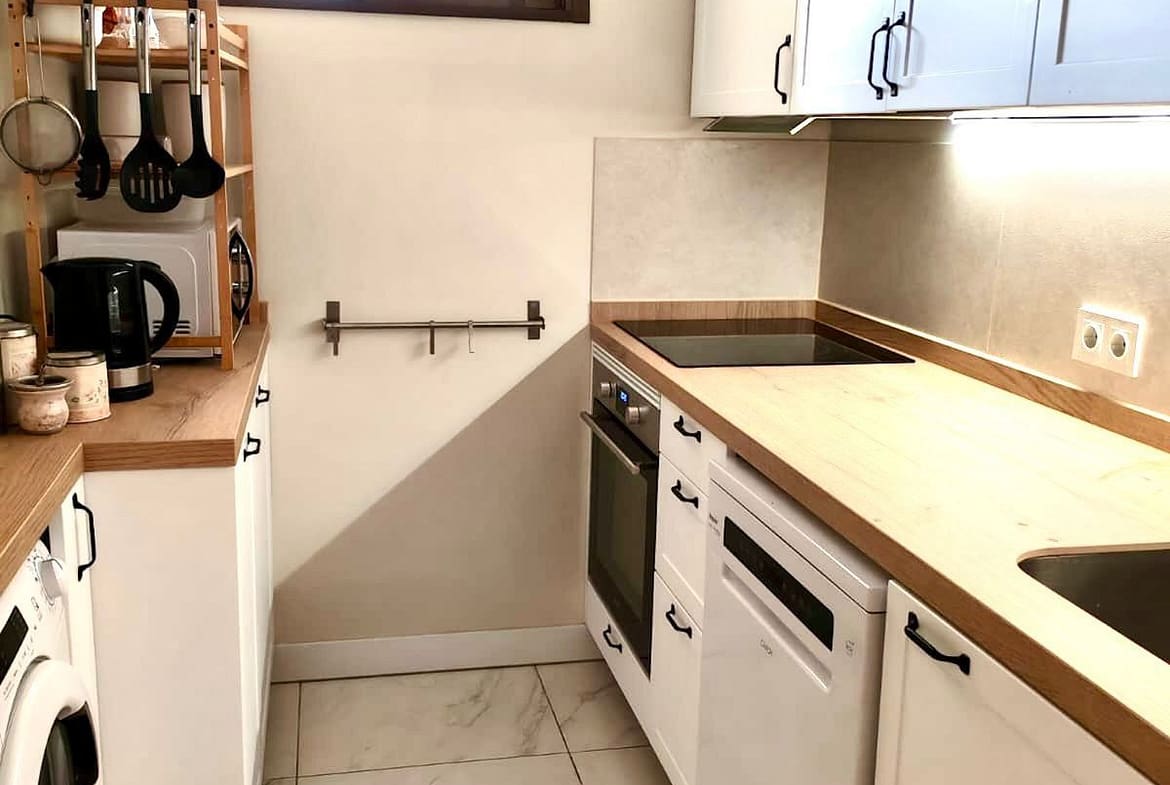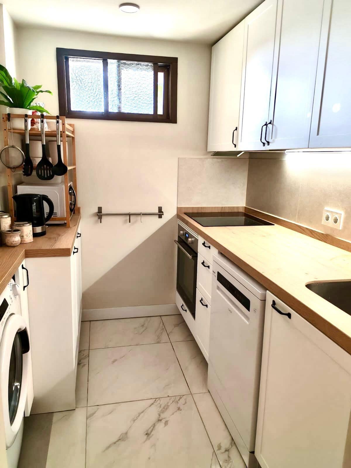 The kitchen is brand new and fully equipped with modern appliances including oven, dishwasher, washing machine, fridge, and glass-ceramic hob. The apartment is completely furnished and everything is fresh and ready for you to enjoy.