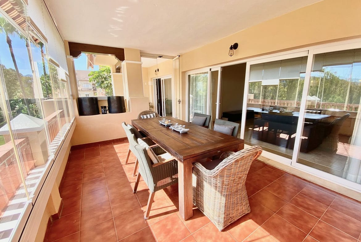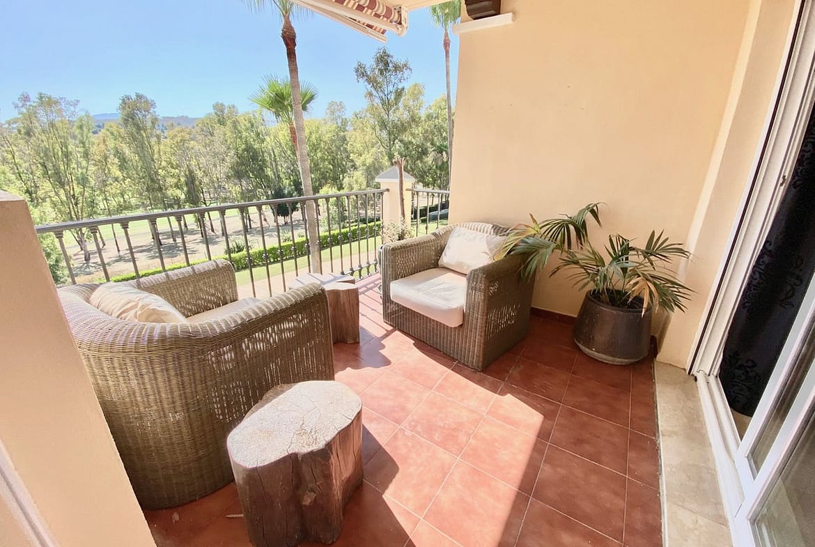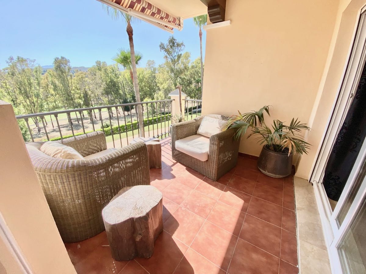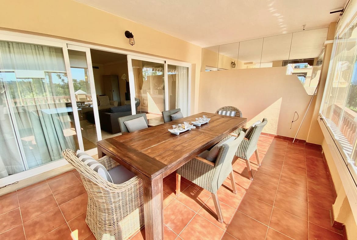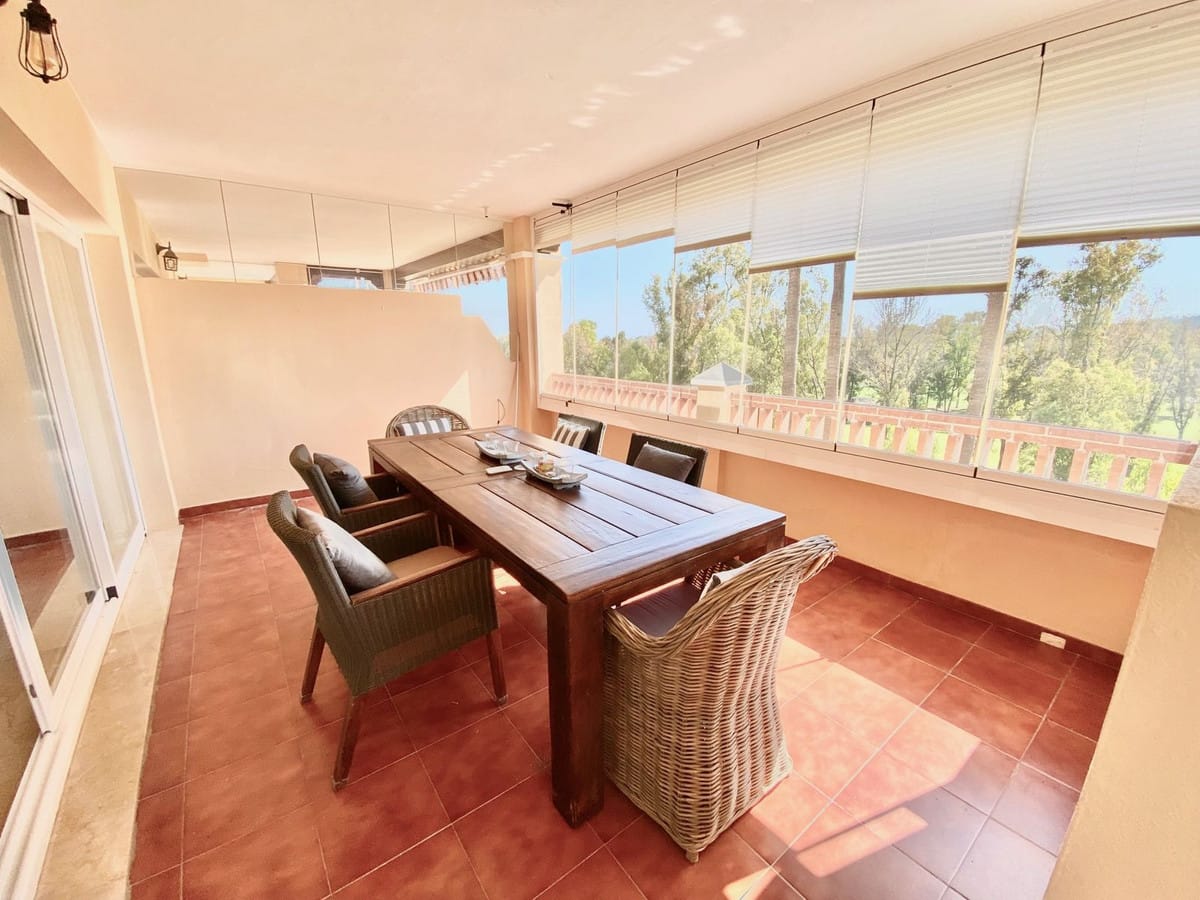 It features 2 bedrooms, 3 bathrooms, and a spacious 34 m² sunny terrace with views of the sea, mountains, and golf course.