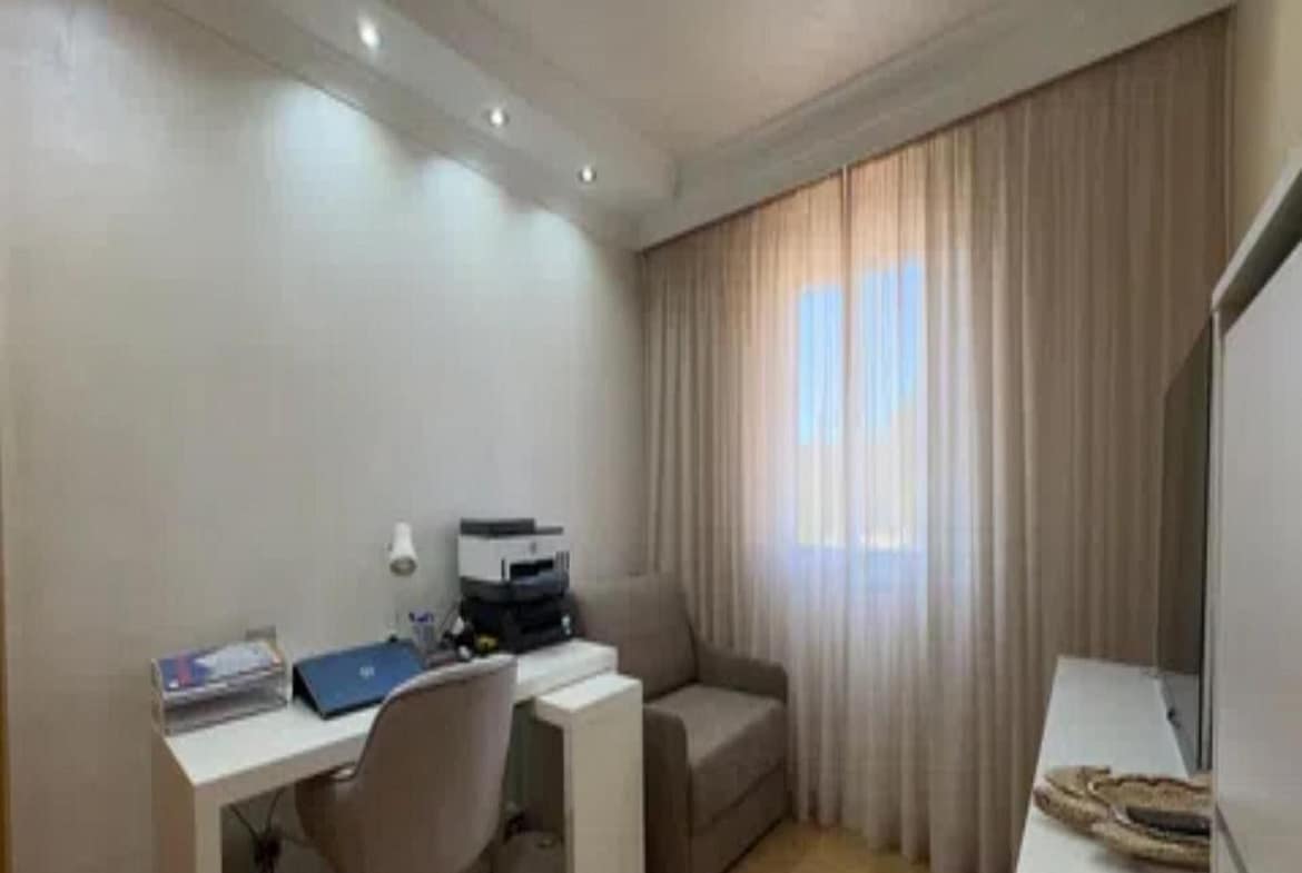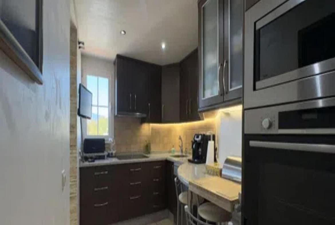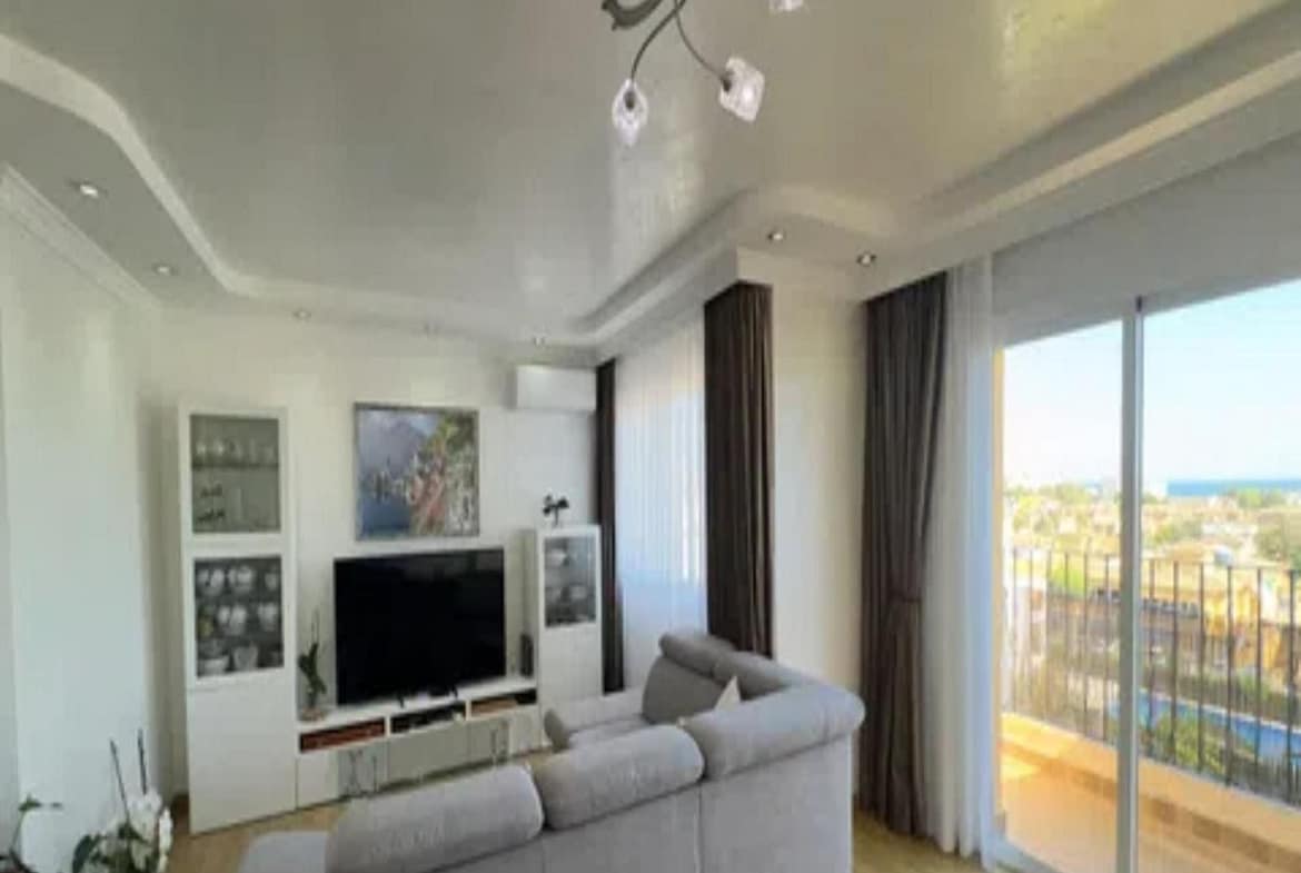 The home offers a bright living room with access to the large private terrace and solarium, perfect for enjoying views of the sea, mountains, gardens, and communal pool. The open-plan kitchen is fully equipped, and the bedrooms have built-in wardrobes and central heating.