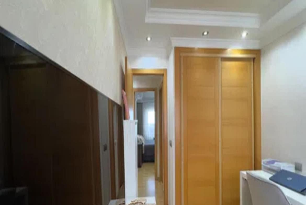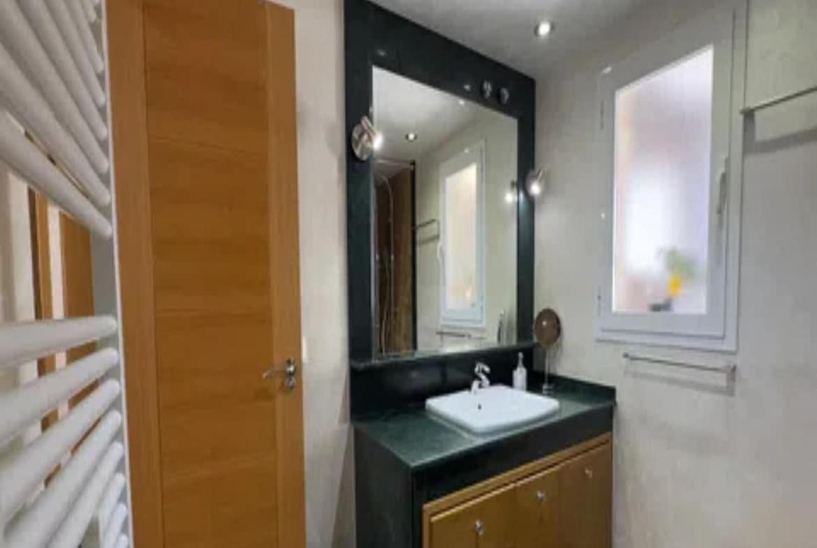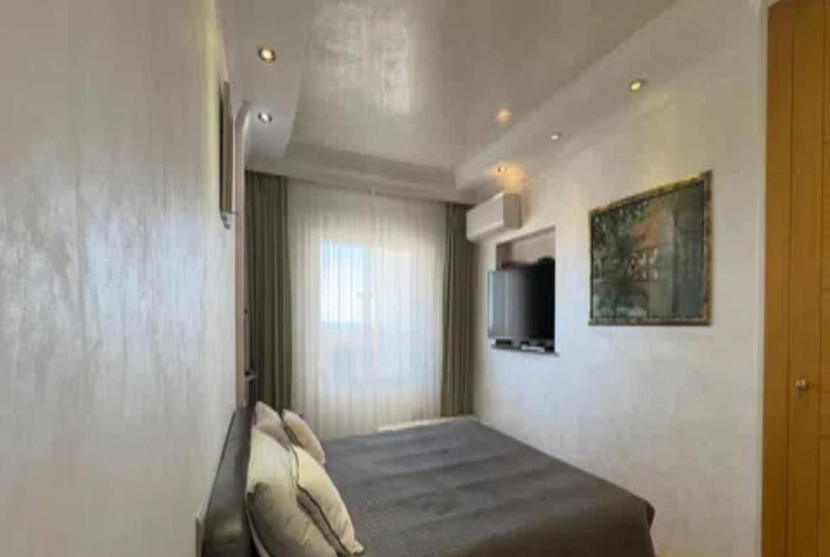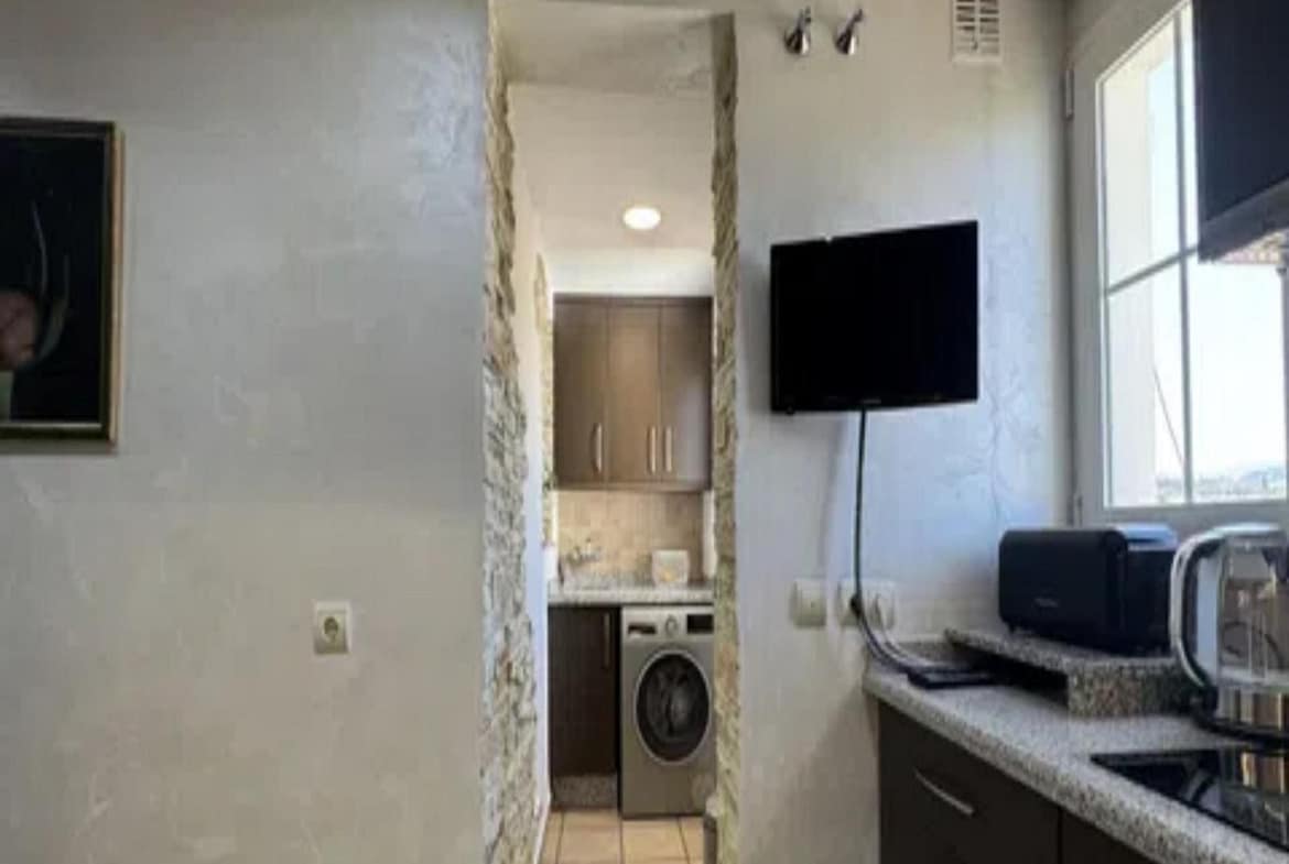 The home offers a bright living room with access to the large private terrace and solarium, perfect for enjoying views of the sea, mountains, gardens, and communal pool. The open-plan kitchen is fully equipped, and the bedrooms have built-in wardrobes and central heating.