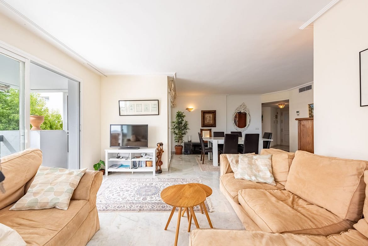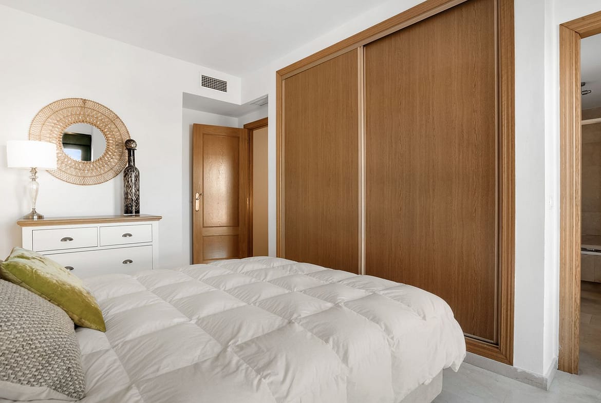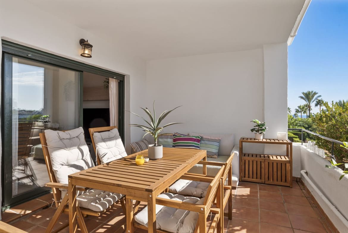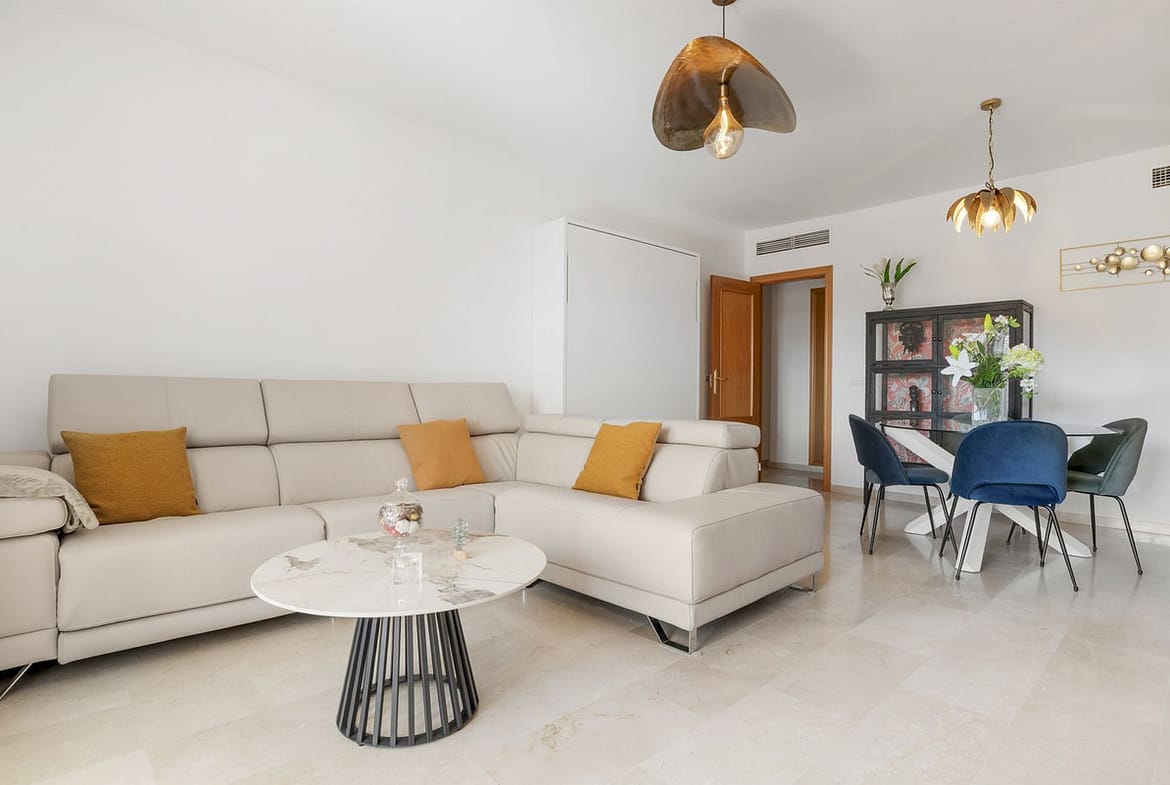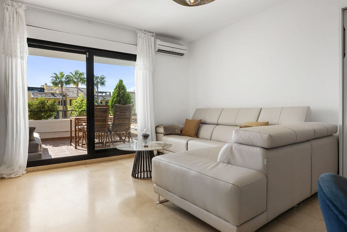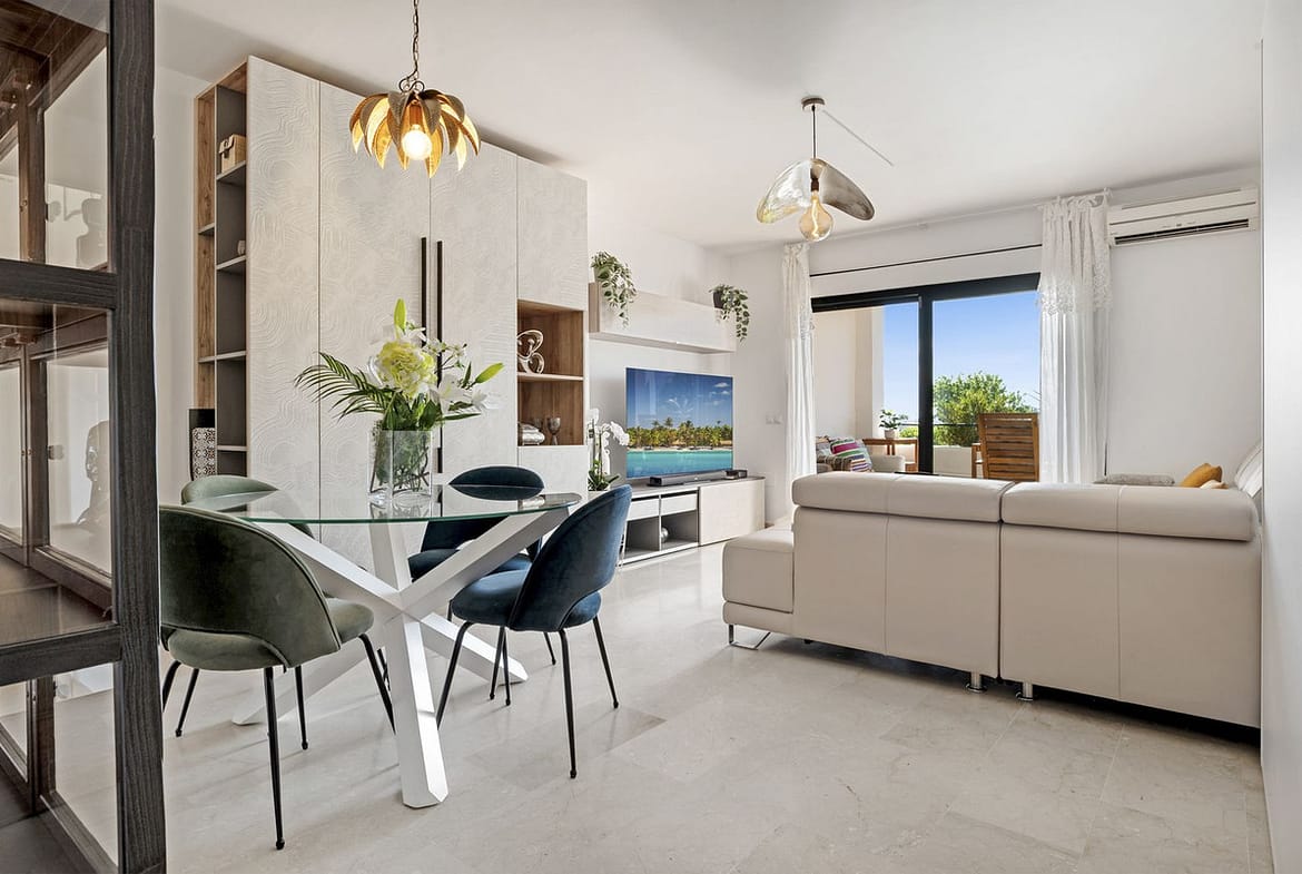 The apartment itself features a spacious living room that opens directly onto a west-facing terrace with open views, ideal for enjoying sunsets and outdoor dining. The master bedroom includes an en-suite bathroom, while the second bedroom and bathroom provide comfortable space for family or guests. The home also boasts a fully equipped kitchen with a utility room for extra practicality.