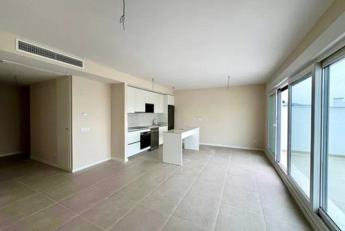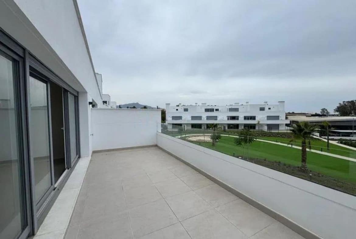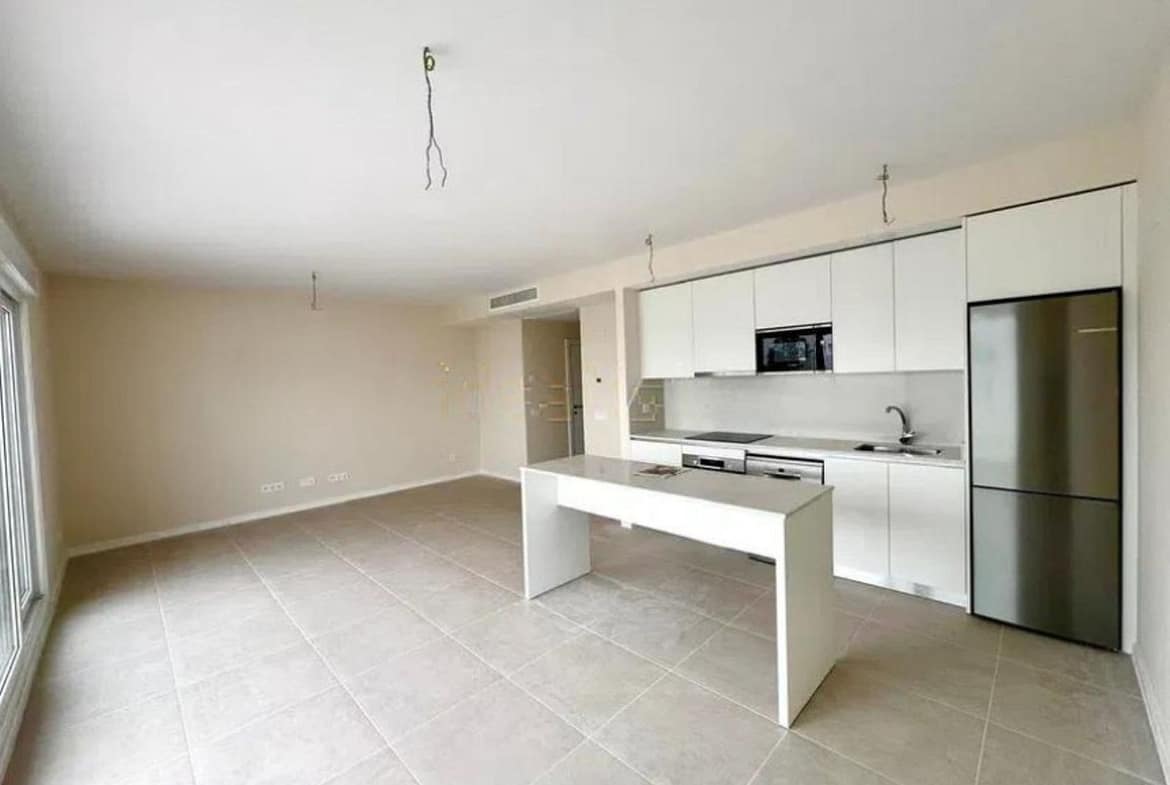 This bright, unfurnished 2-bedroom apartment pairs a practical layout with a calm outlook over the green communal landscape and a distant sea view from the terrace.