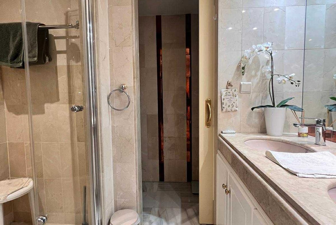The bedrooms have built-in wardrobes. Everything is perfectly maintained and fitted with timeless materials, including lots of marble in the bathrooms with spacious showers.