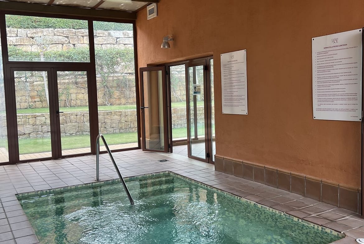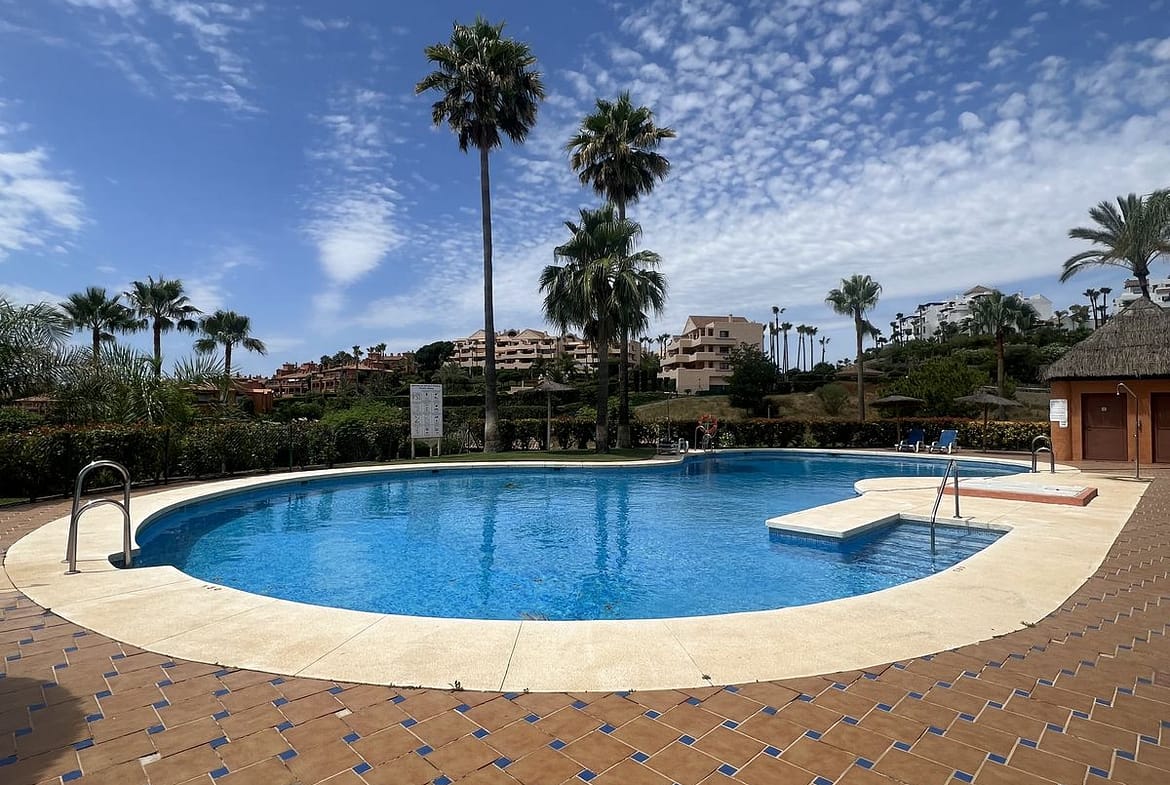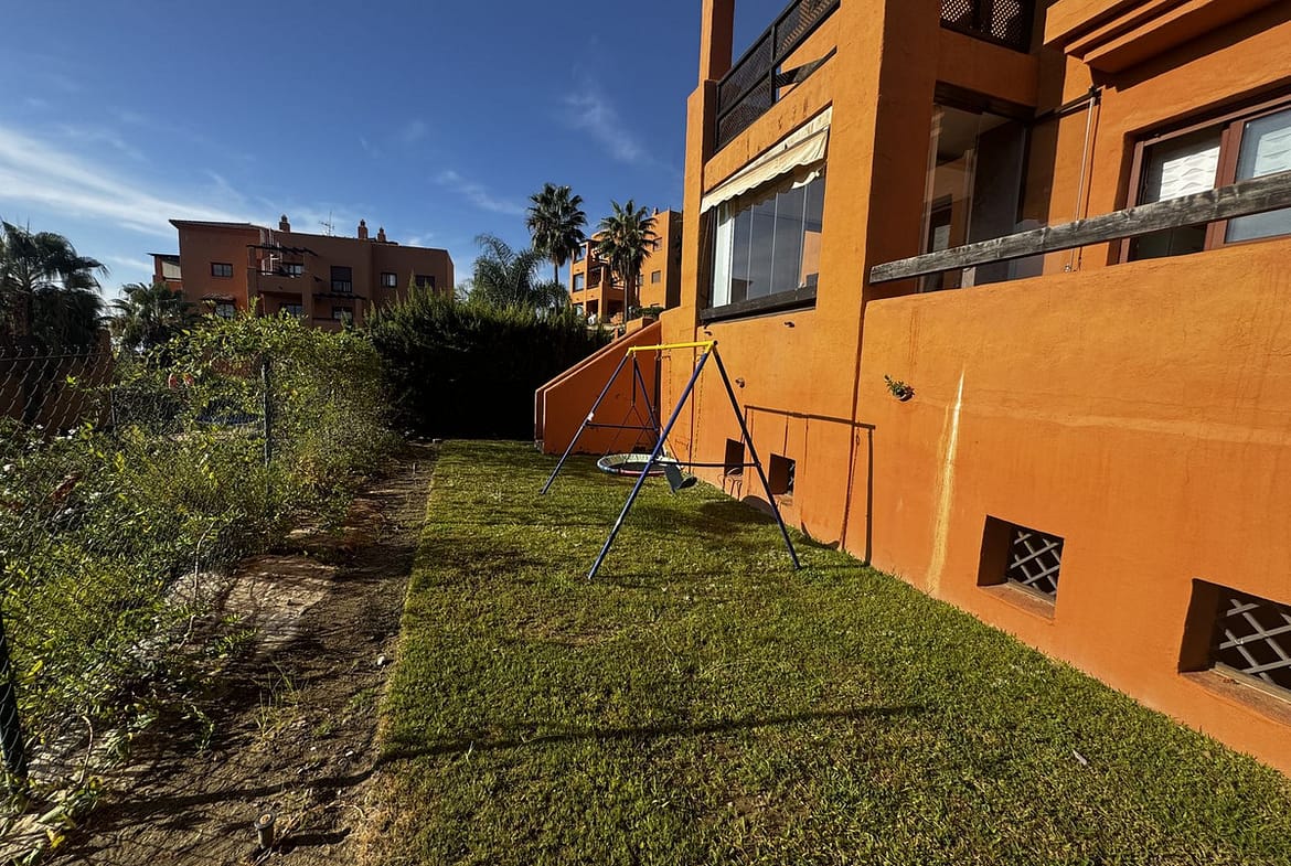 Entrance hall, fully equipped kitchen with separate laundry room, living-dining room with access to the covered terrace or second living room, and terrace with views of the pool and private garden. Two bedrooms with two fully renovated bathrooms, the master en suite. A 20 m2 garden is for private use and is maintained by the community.
