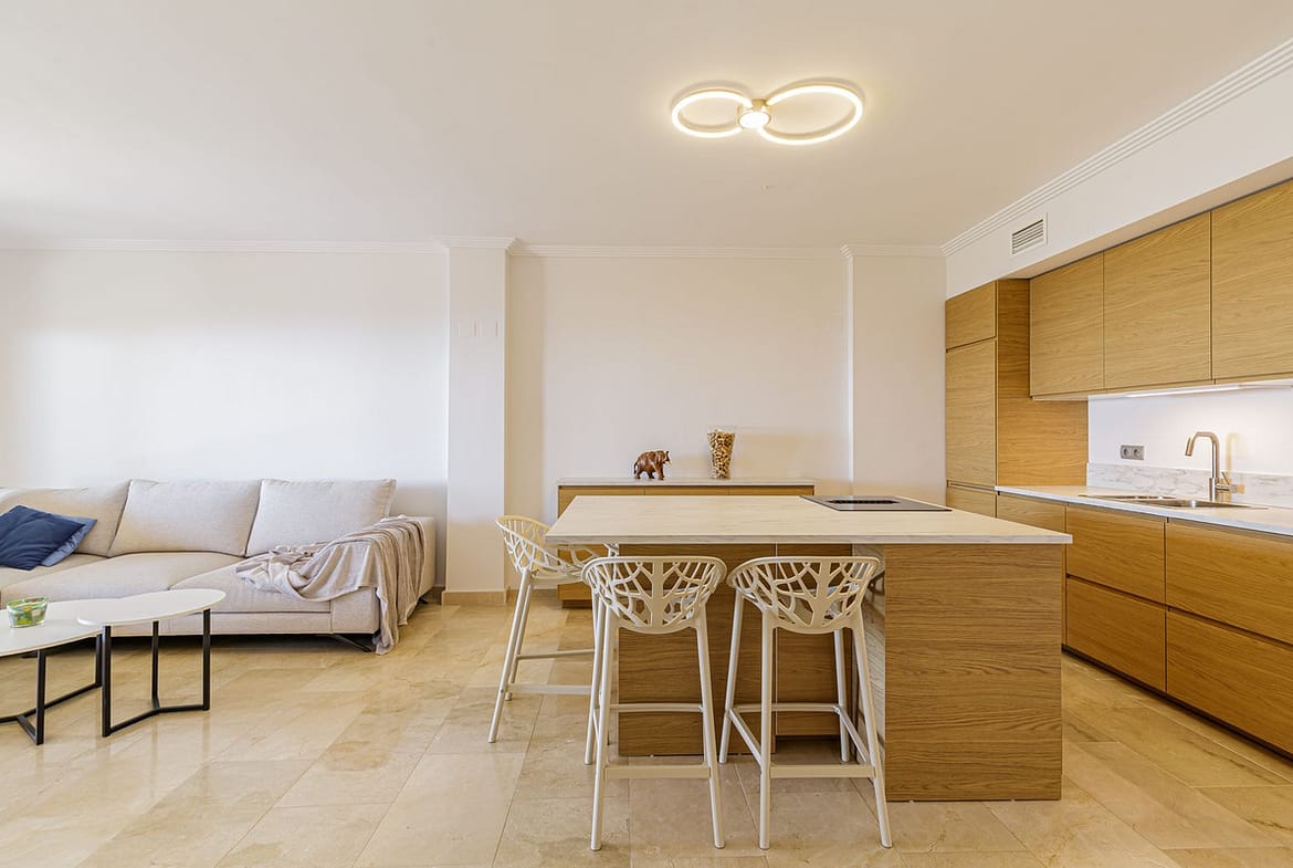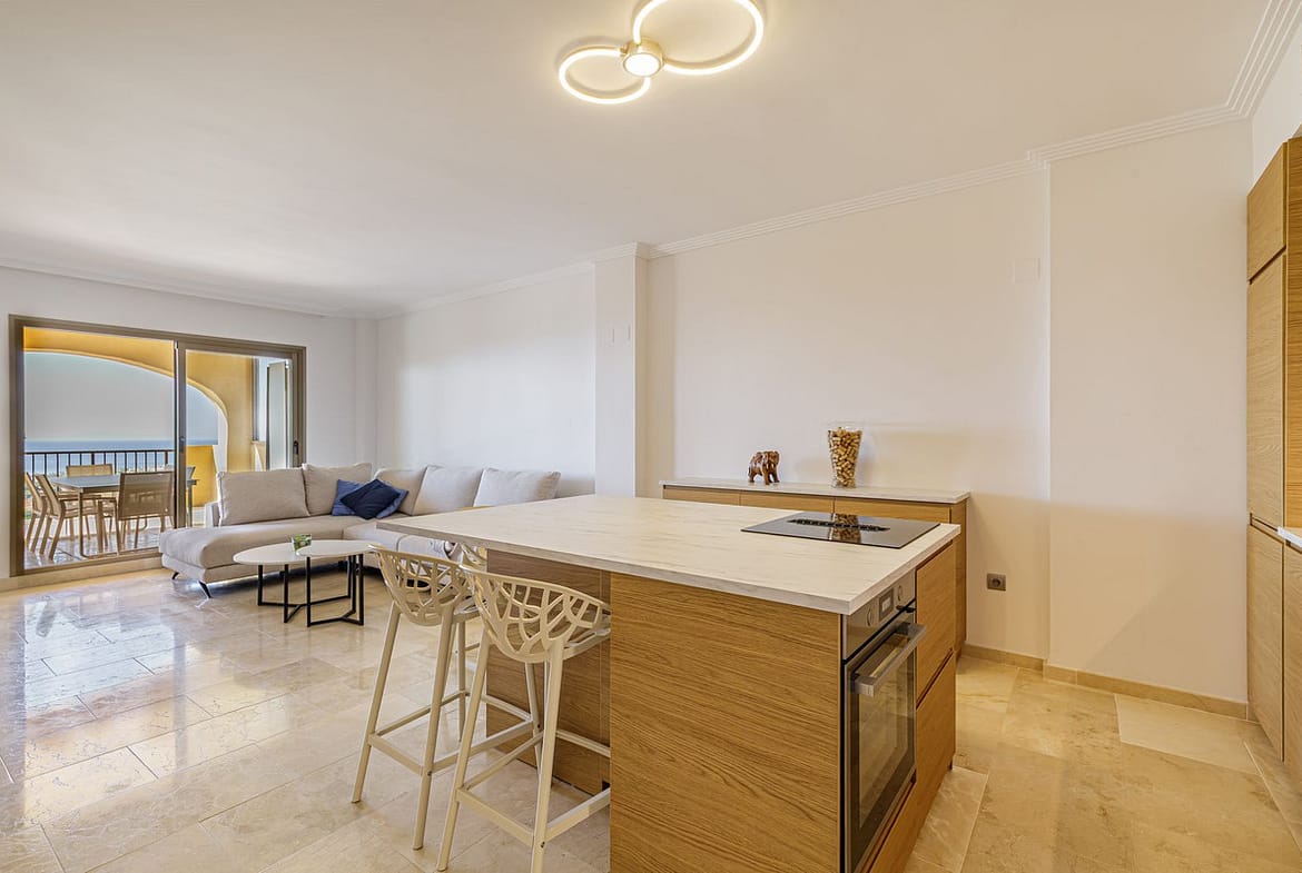 This bright and spacious 3-bedroom, 2-bathroom apartment features a sophisticated interior layout with a brand new open-plan kitchen complete with a central island, premium appliances, and sleek cabinetry. The living and dining area flows effortlessly onto a large covered terrace, offering an ideal setting for outdoor dining, lounging, and enjoying the impressive coastal views.