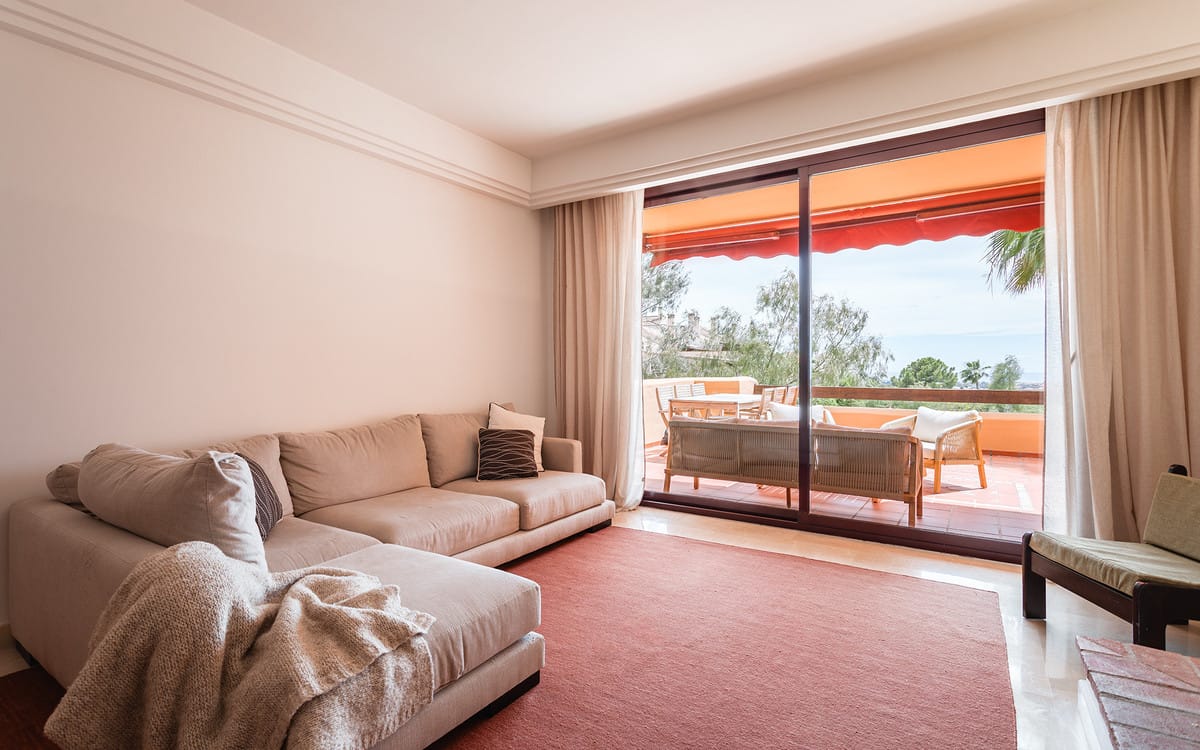 Perched just below the Monte Halcones commercial centre in the quiet Puerto del Almendro urbanisation, this spacious first-floor apartment offers an exceptional blend of privacy, panoramic sea views, and refined comfort. Located within a secure, impeccably maintained gated community, the property enjoys total tranquillity while being just a 5-minute drive from the beach and San Pedro, and a short stroll to local shops, restaurants, and cafés.