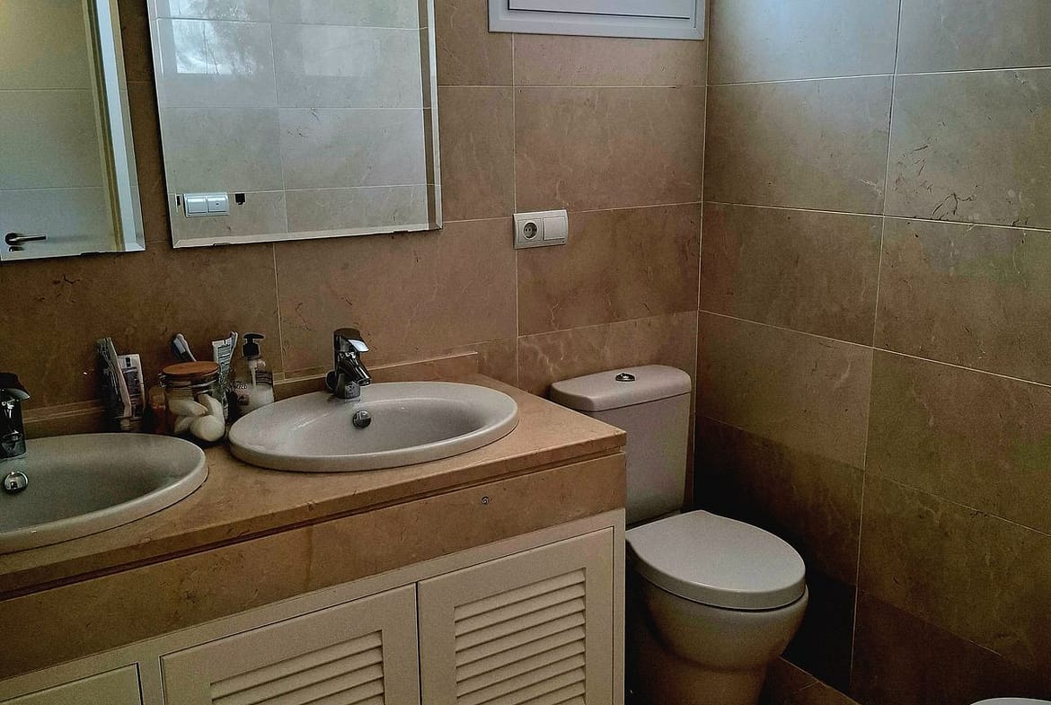 The apartment faces south, ensuring plenty of natural light and a warm, welcoming atmosphere throughout the day. It features two bedrooms and two bathrooms, including a master bedroom with en-suite bathroom and direct access to the spacious terrace. From here, you can enjoy beautiful views and even see a glimpse of the sea – the perfect spot to relax and soak up the Mediterranean sunshine.