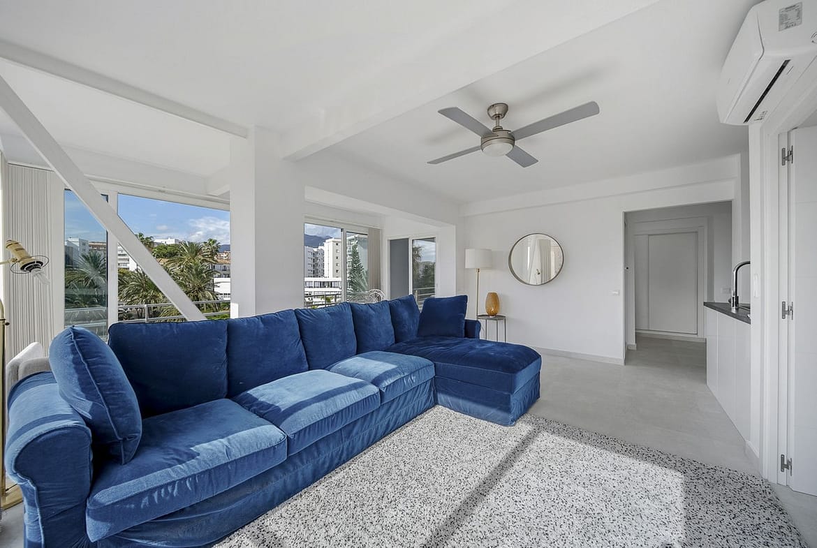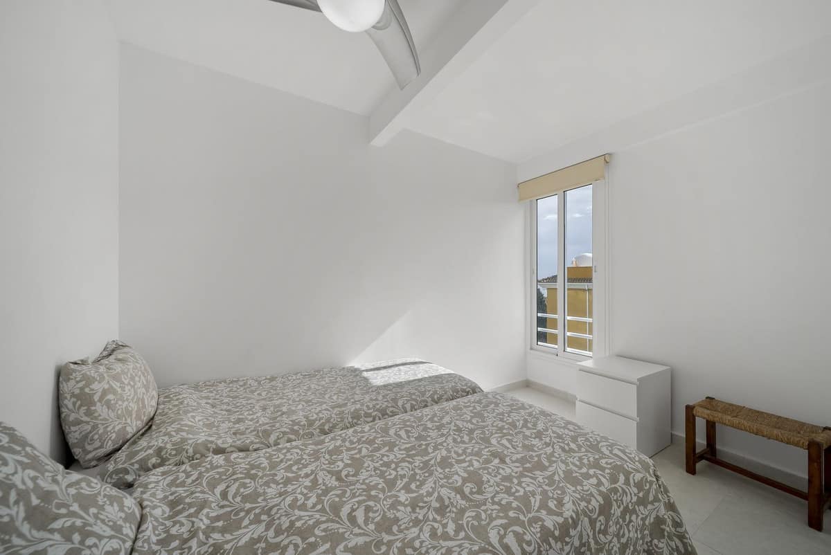 Both bedrooms are well-proportioned, and the property is equipped with air conditioning for year-round comfort. The modern bathroom is elegantly finished, continuing the apartment’s fresh and updated feel throughout.