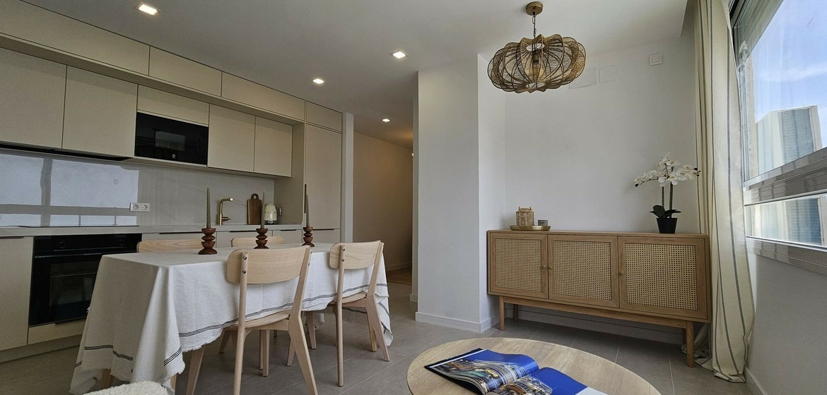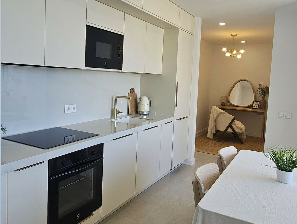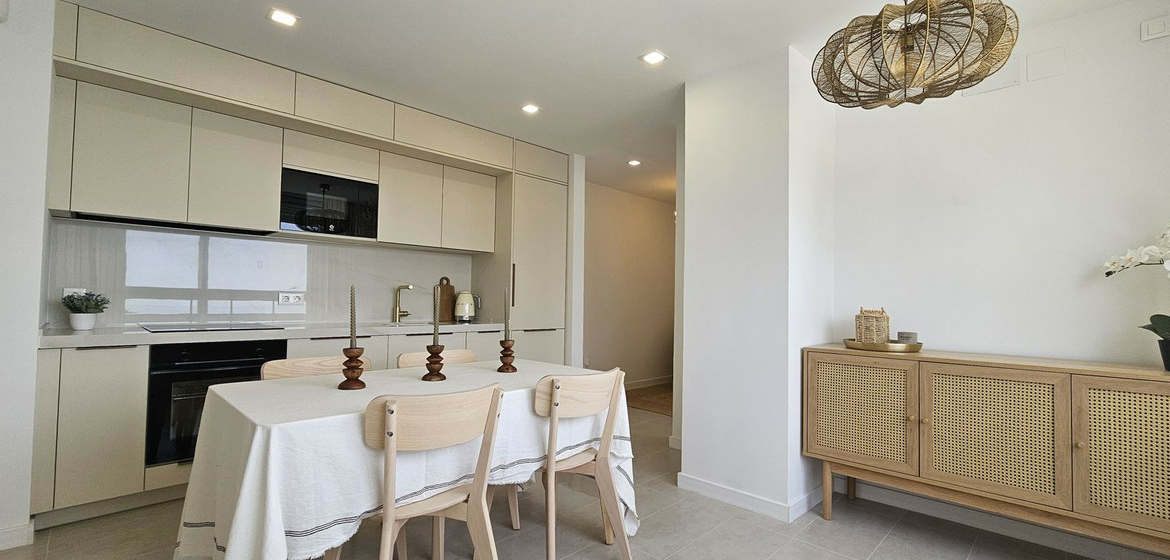 “Discover your new home by the sea! This spectacular 100% renovated apartment offers a modern and elegant design, with excellent quality materials that guarantee a cozy and functional environment. With 36 m² built, the property has a master bedroom with a built-in dressing room and a second room ideal as an office or adaptable to a second bedroom. The kitchen, integrated into the bright main living room, has been designed by Cocinas “SCHMIDT”, which adds a touch of distinction to this space.