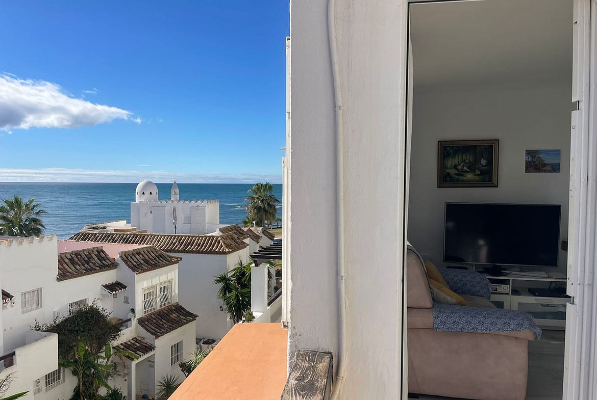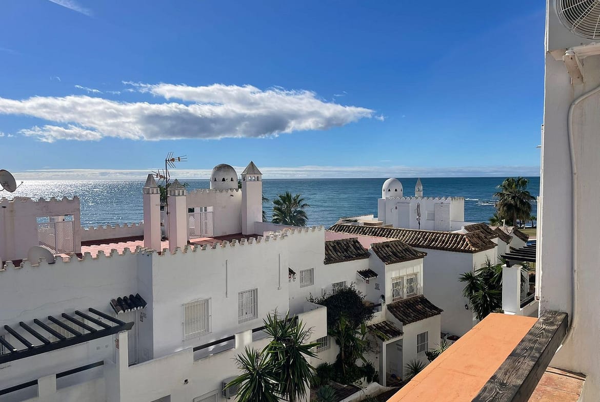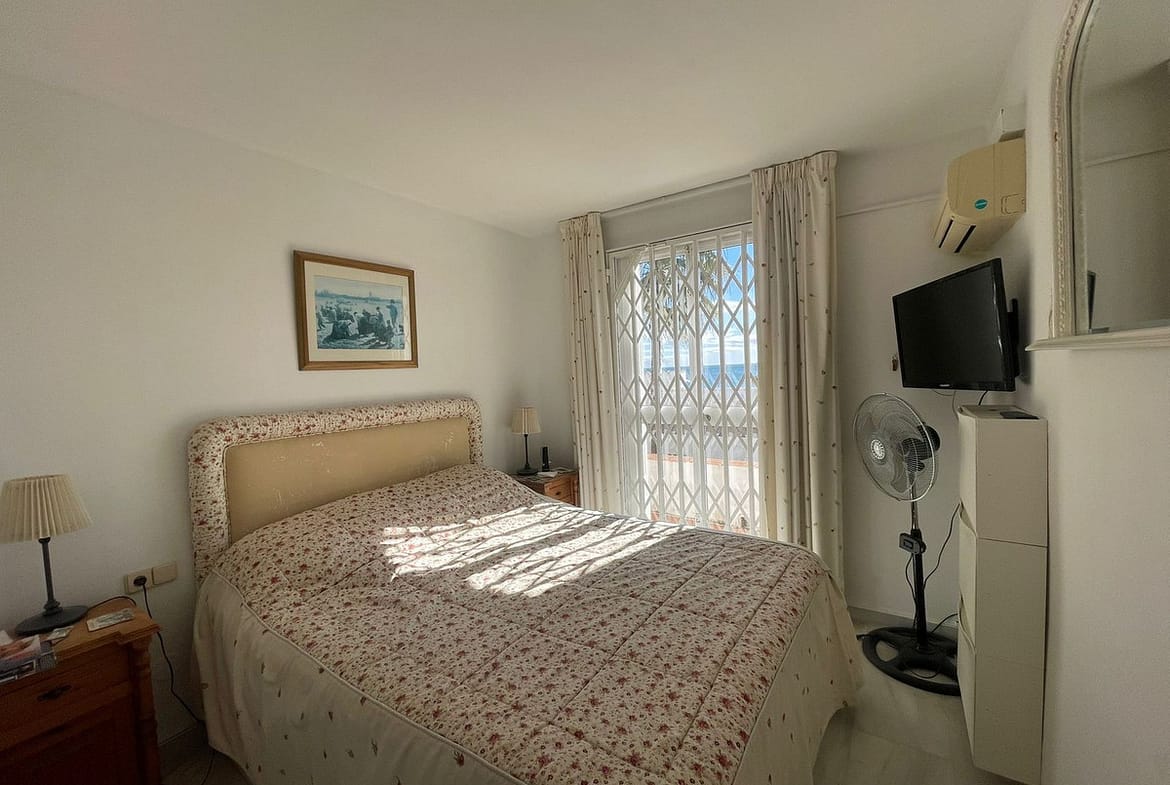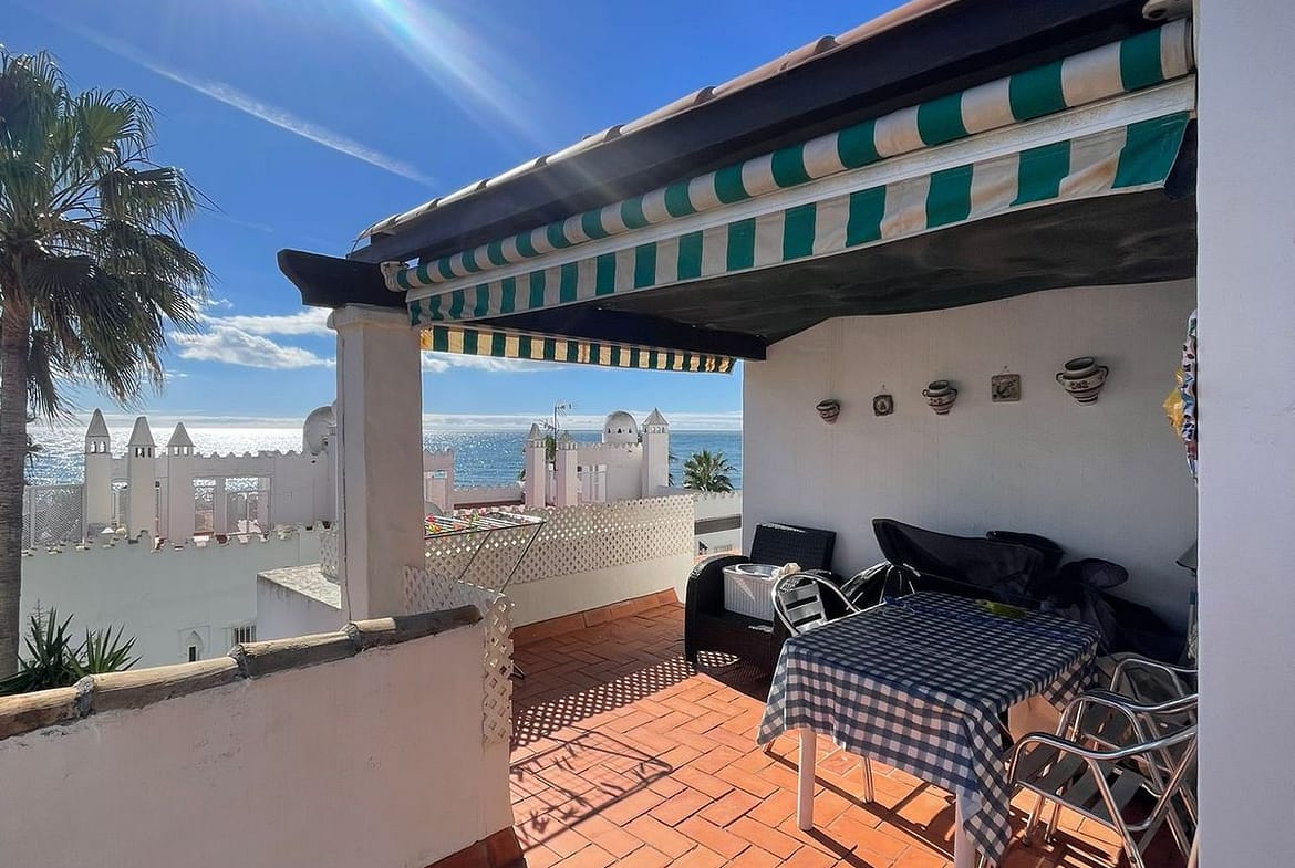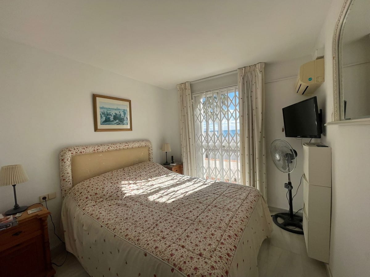 Corner penthouse for sale in one of the best beachfront developments in Mijas Costa, Calahonda. The apartment is on the first floor (no lift) and has 2 exterior bedrooms and 2 full bathrooms (with the possibility of easily converting it into 3 bedrooms), with a large corner and private terrace. From the apartment there is an impressive sea view, from the kitchen, living room, bedroom and terrace. The apartment is sunny all day, especially in winter when the sun is lower. There is new air conditioning (split, hot and cold) in the living room and in the master bedroom. The kitchen is large, exterior with a window and fully equipped, with a serving hatch that opens onto the dining area. The dining room and living room are spacious and sunny. There are built-in wardrobes in both bedrooms. There is a private parking space included in the price. It is a gated community with communal gardens and a large swimming pool facing the sea. You can exit through the community directly to the beach and can walk easily to several restaurants, beach bars, supermarket, pharmacy etc. We have refurbished several apartments of a similar size in the same urbanization for our investors from 2 bedroom to 3 bedroom apartments and we can show you before and after of those units, and you can visit them personally to get an idea of what can be done.