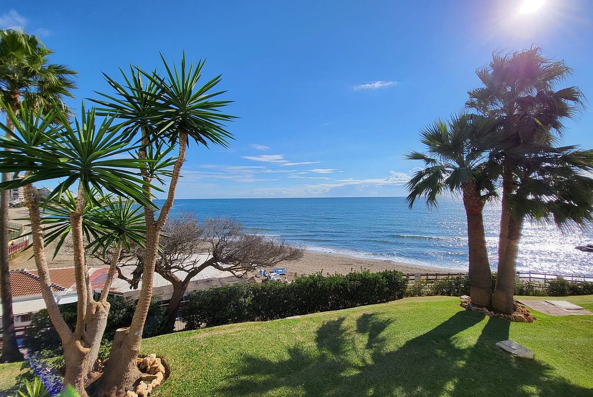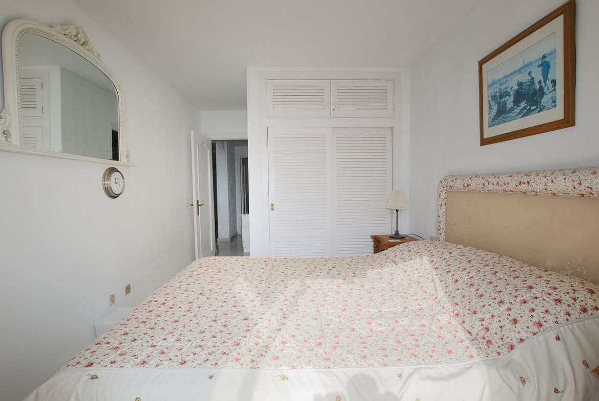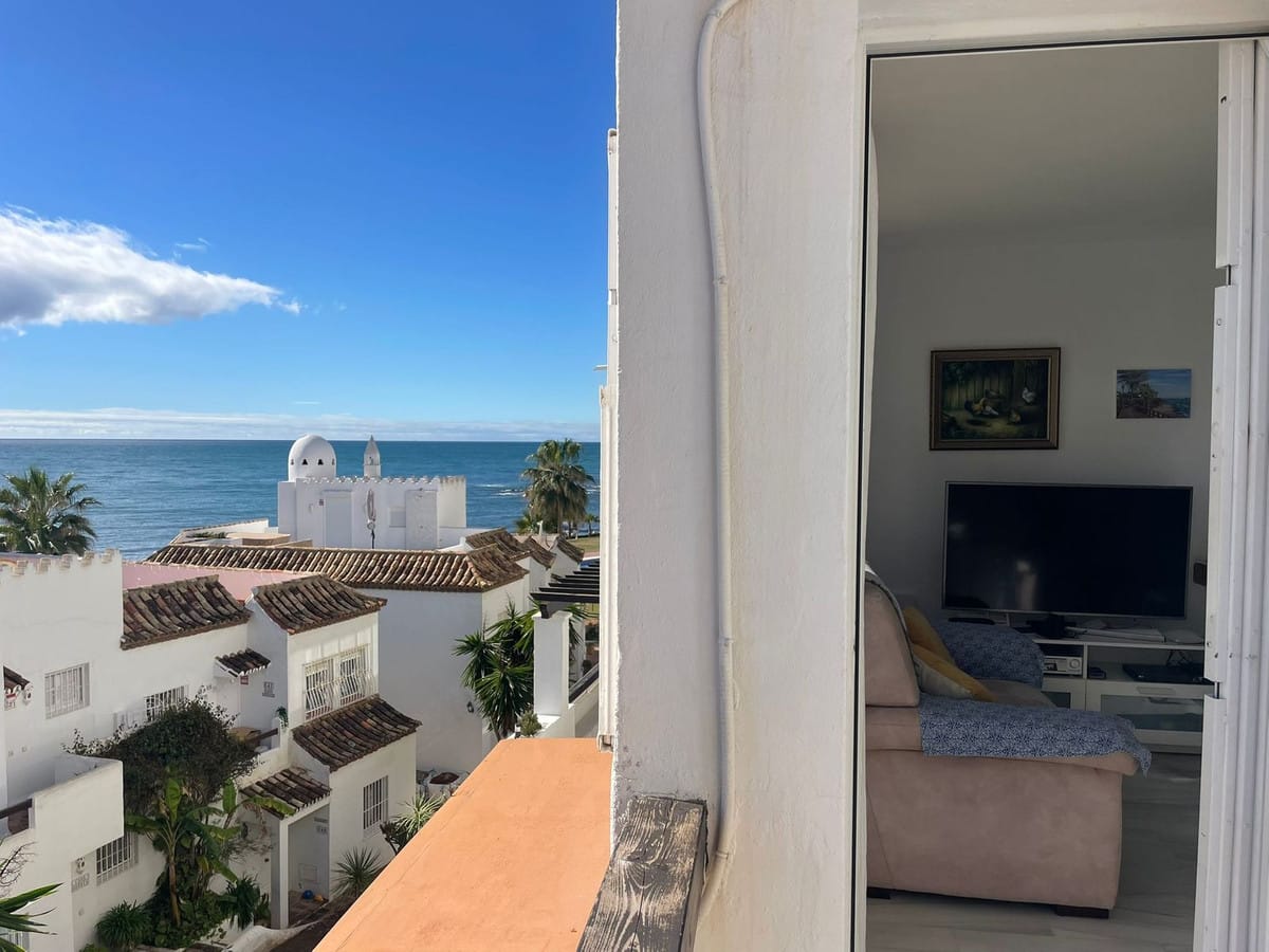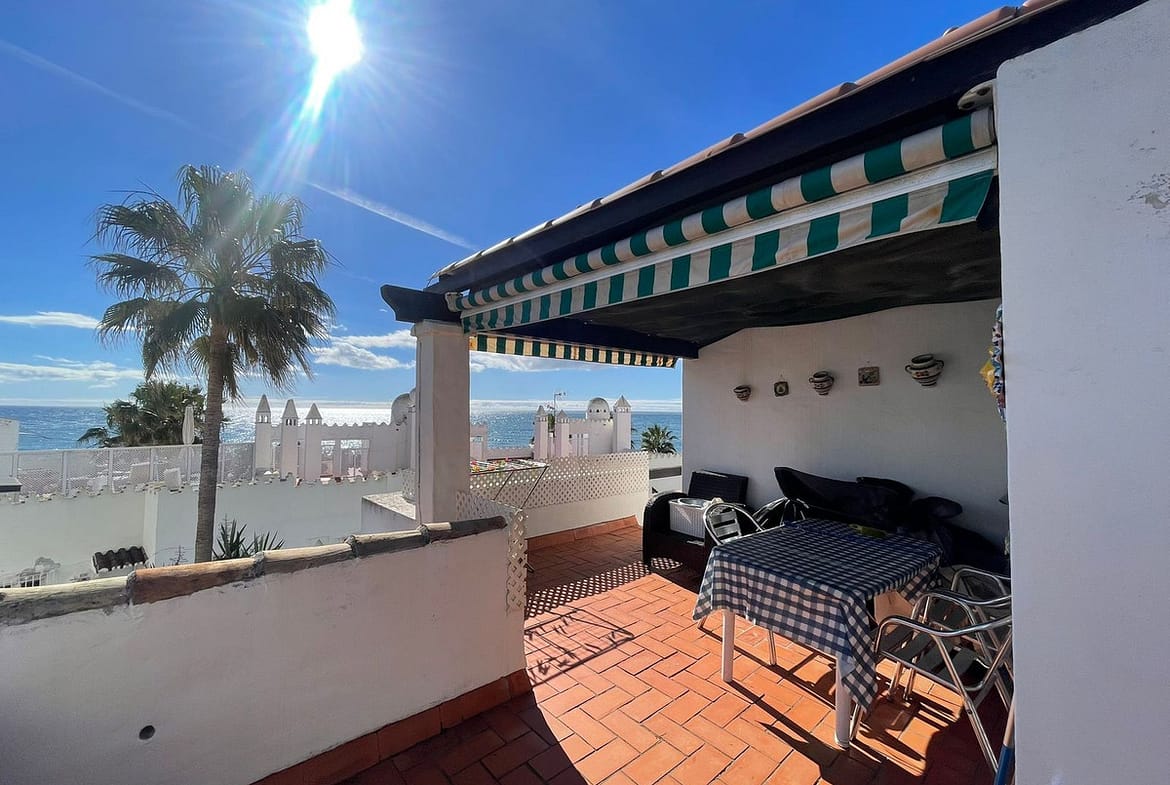 Corner penthouse for sale in one of the best beachfront developments in Mijas Costa, Calahonda. The apartment is on the first floor (no lift) and has 2 exterior bedrooms and 2 full bathrooms (with the possibility of easily converting it into 3 bedrooms), with a large corner and private terrace. From the apartment there is an impressive sea view, from the kitchen, living room, bedroom and terrace. The apartment is sunny all day, especially in winter when the sun is lower. There is new air conditioning (split, hot and cold) in the living room and in the master bedroom. The kitchen is large, exterior with a window and fully equipped, with a serving hatch that opens onto the dining area. The dining room and living room are spacious and sunny. There are built-in wardrobes in both bedrooms. There is a private parking space included in the price. It is a gated community with communal gardens and a large swimming pool facing the sea. You can exit through the community directly to the beach and can walk easily to several restaurants, beach bars, supermarket, pharmacy etc. We have refurbished several apartments of a similar size in the same urbanization for our investors from 2 bedroom to 3 bedroom apartments and we can show you before and after of those units, and you can visit them personally to get an idea of what can be done.