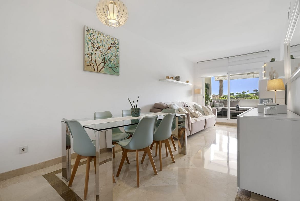 Lovingly cared for and partially renovated, this inviting home is ready to move into. The living and dining area flows effortlessly onto a private terrace, where you can enjoy stunning panoramic views over the lush Calanova Golf Course — the ideal setting for morning coffee or evening sunsets. Both bedrooms are generously sized with fitted wardrobes, while the two modern bathrooms (one en-suite) ensure convenience for residents and guests alike.