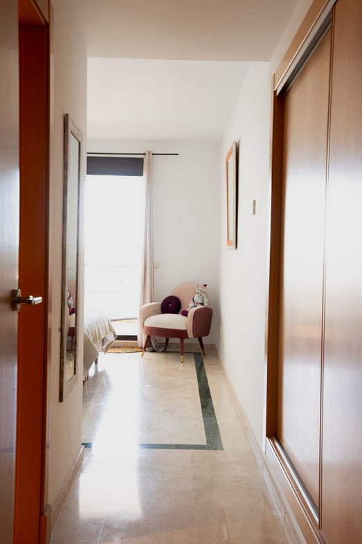The property boasts a spacious, fully equipped kitchen with a separate utility room, as well as a bright and inviting living and dining area. From here, you step out onto a generous covered terrace with a desirable west-facing orientation, perfect for enjoying afternoon sun and sunsets. The terrace is fitted with fully foldable glass curtains, allowing for year-round use while offering lovely views over the communal gardens, the surrounding countryside, and even glimpses of the sea.