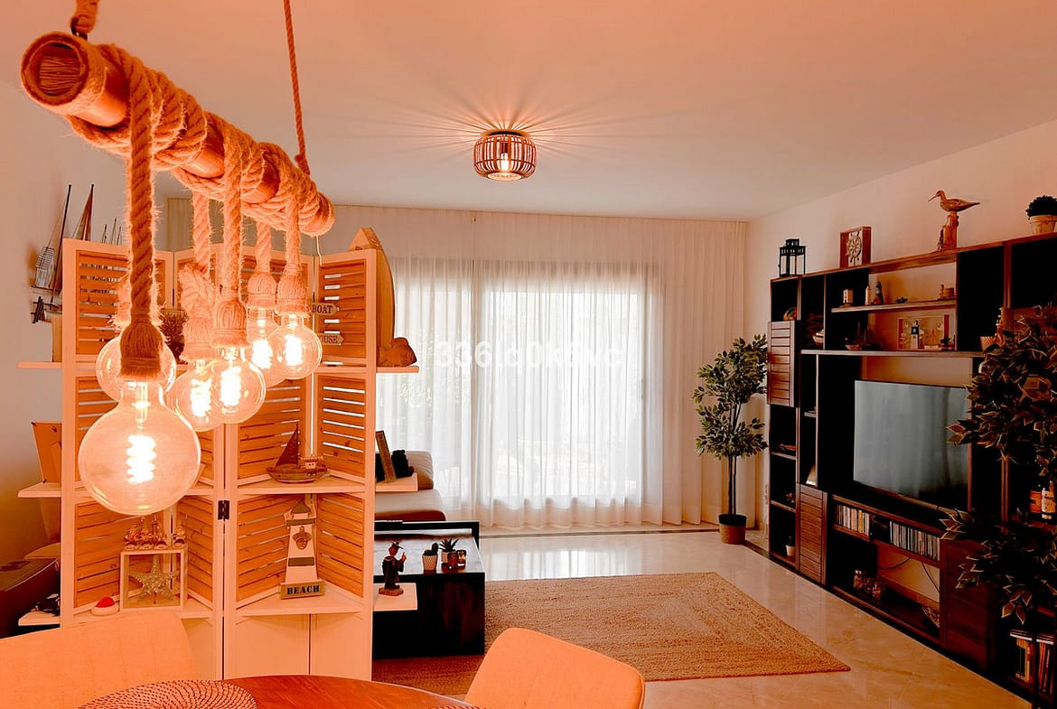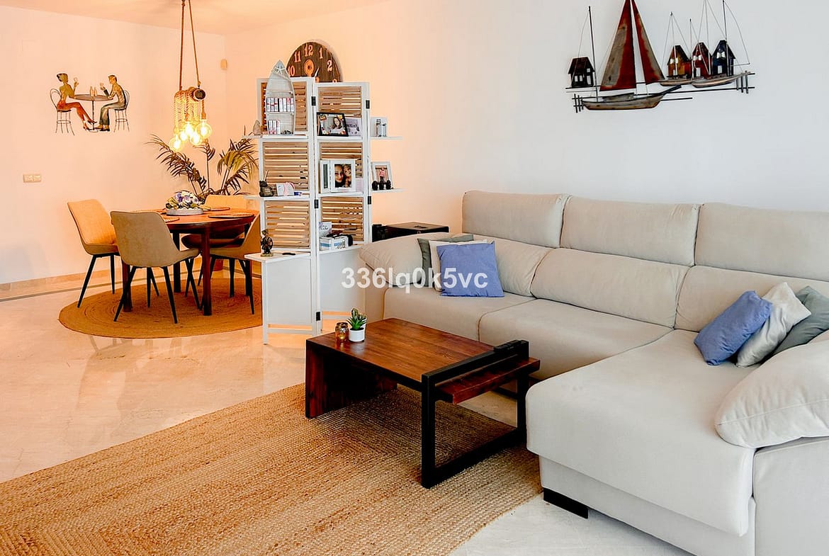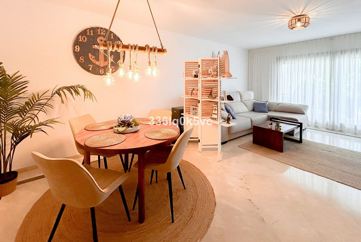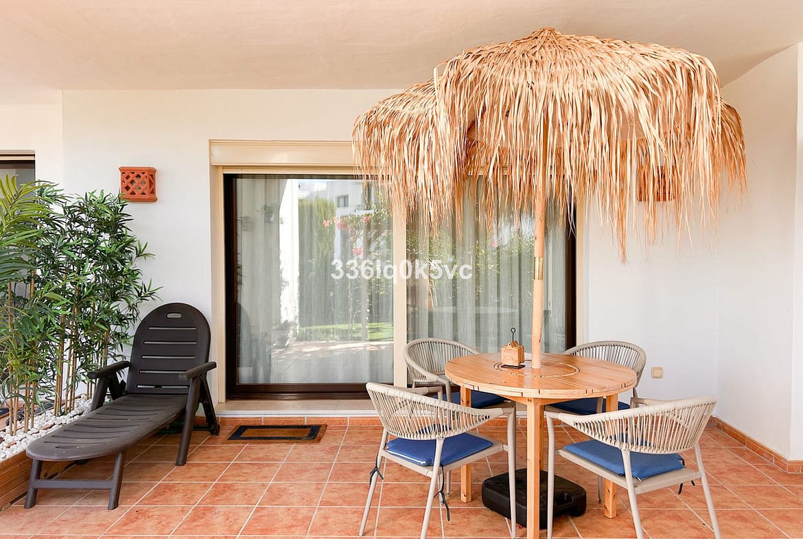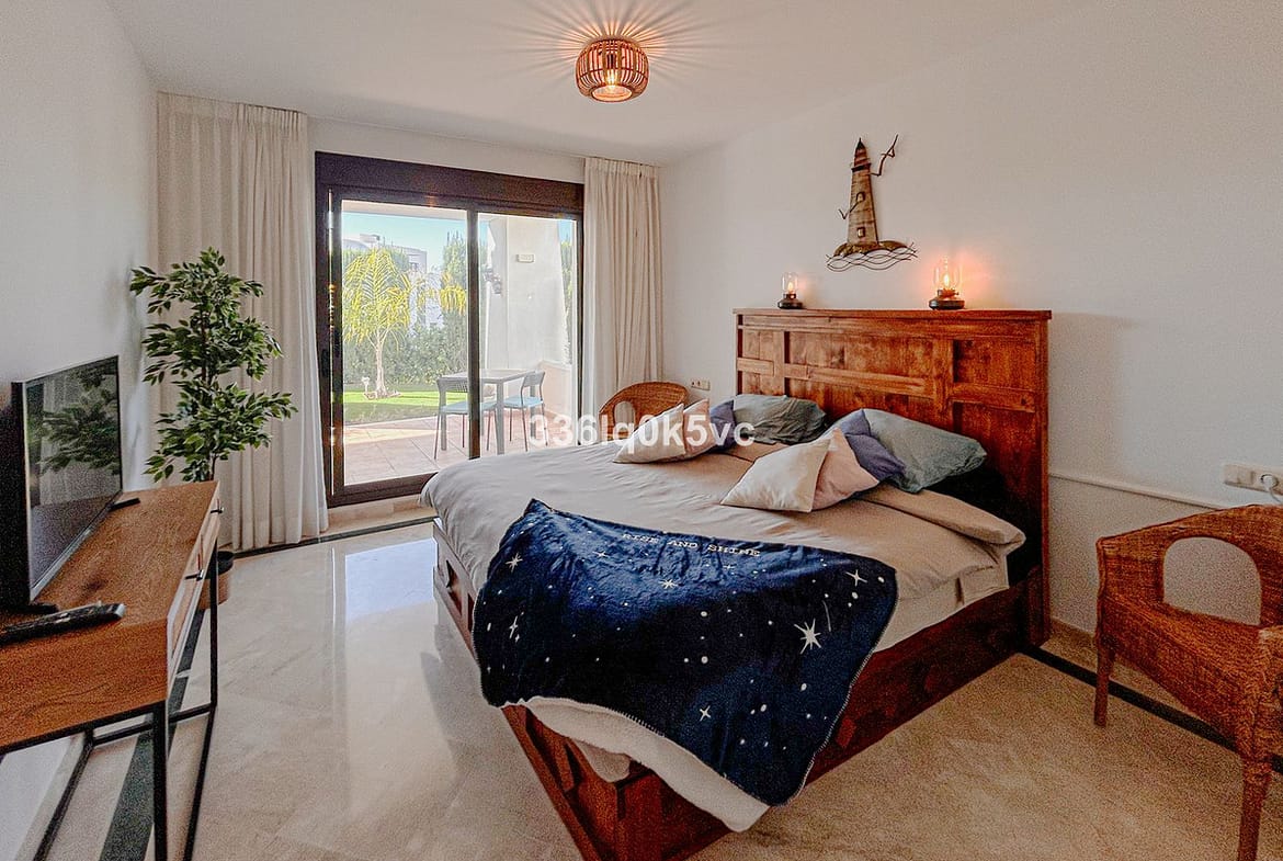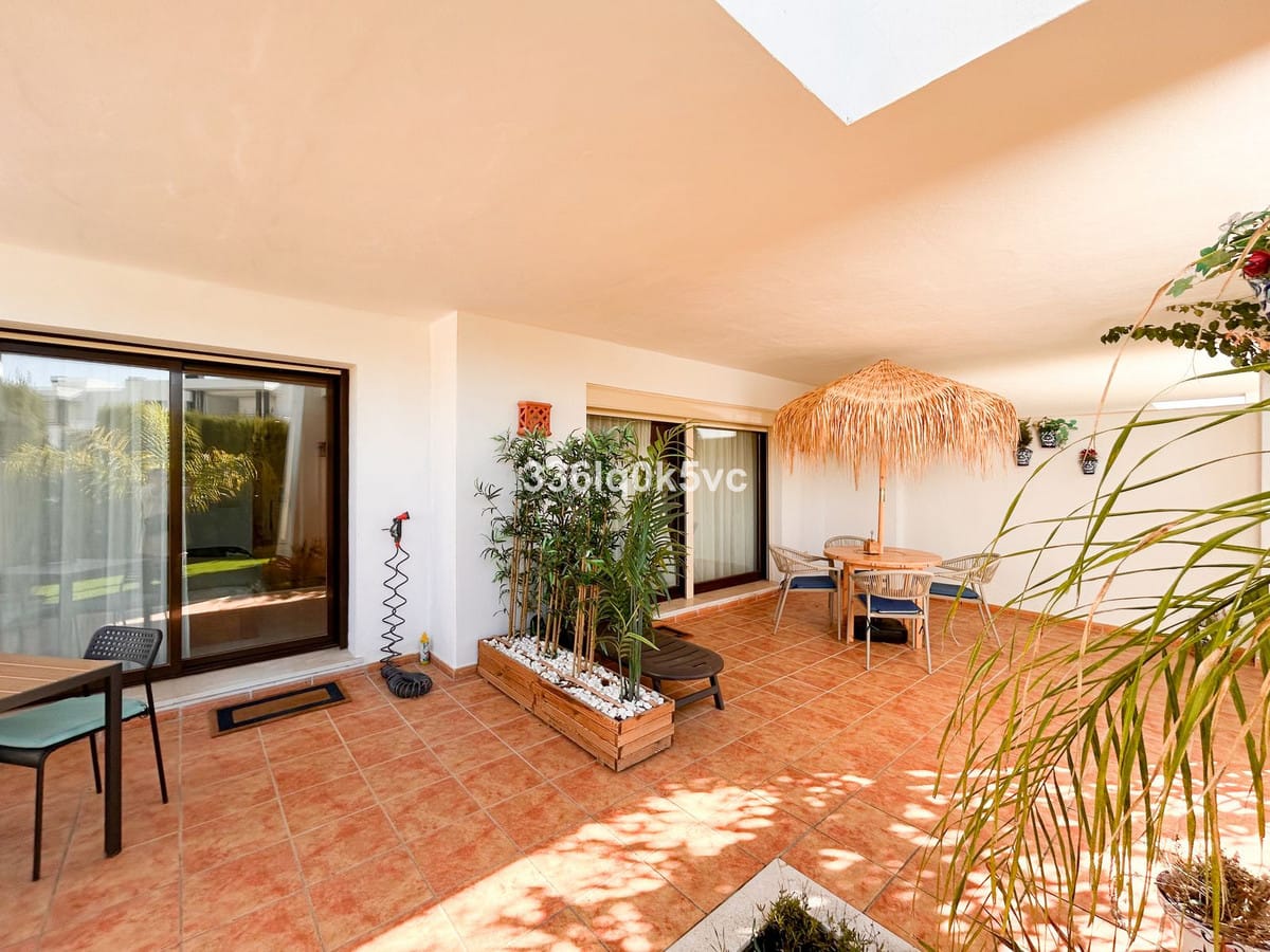 This modern 2-bedroom, 2-bathroom apartment is located in the prestigious Casares Golf Garden development, just a few kilometers from the coast. The apartment features a spacious and bright living room with a closed kitchen, perfect for cozy evenings. From the living room, you have access to a covered terrace that overlooks a private southeast-facing garden with sun all day, ideal for enjoying the outdoor lifestyle.