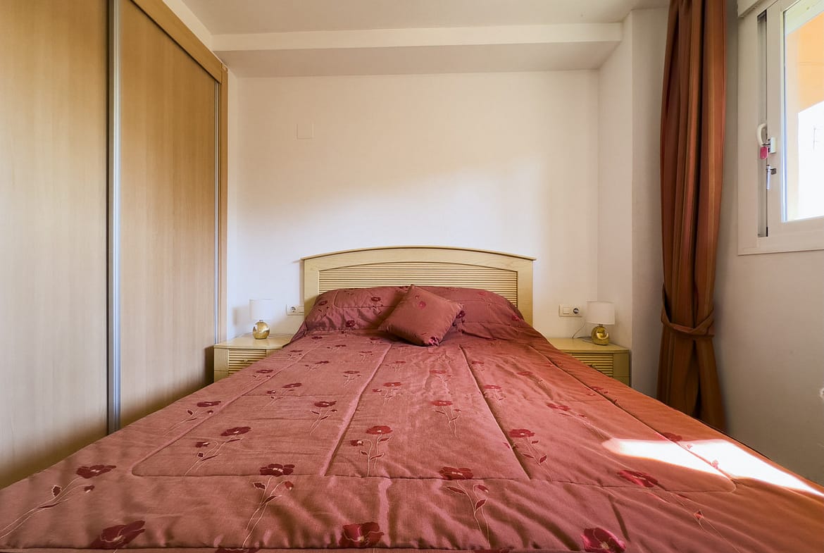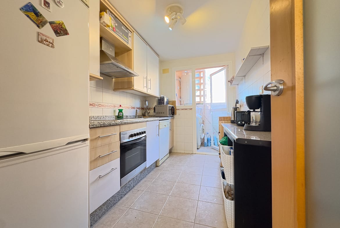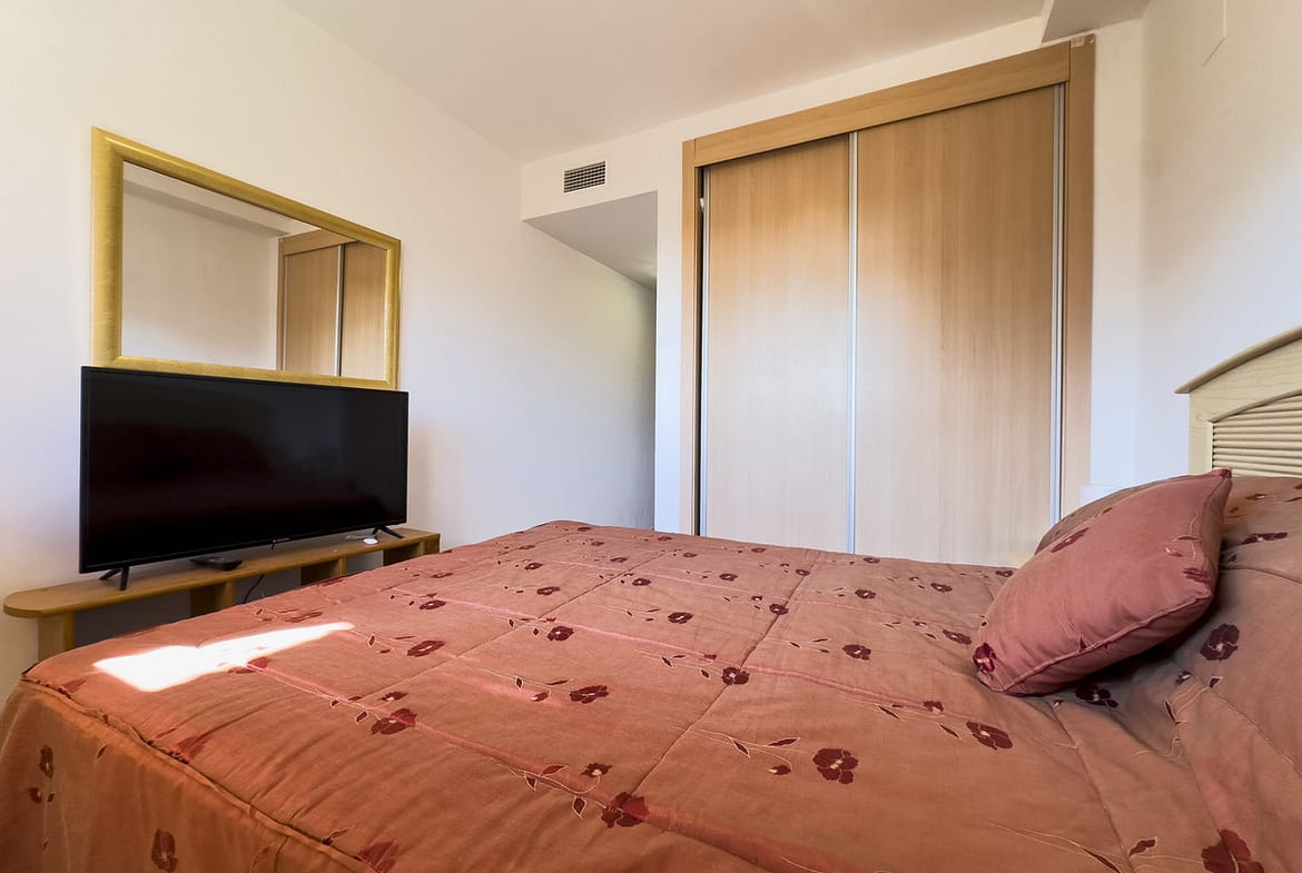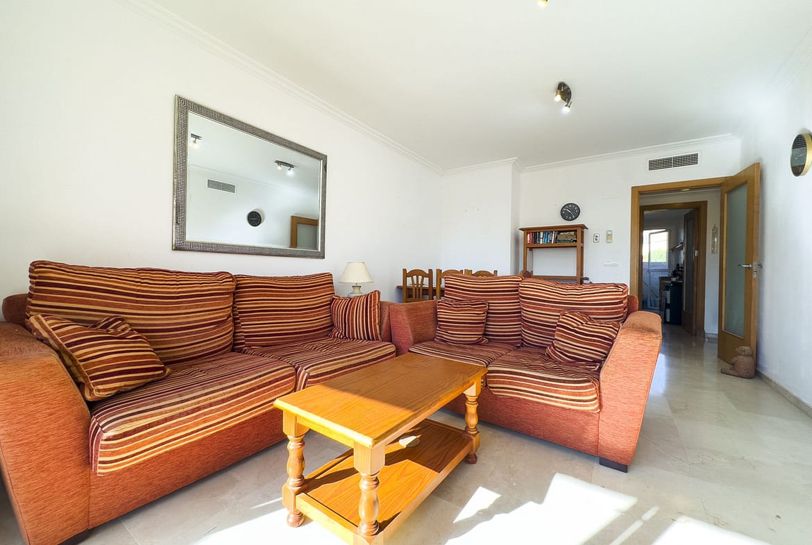 The 80 m² built and 70 m² interior home offers a functional and bright layout, with two bedrooms and two bathrooms, one of them en suite. The main living room opens onto a 15 m² private covered terrace, ideal for enjoying the Mediterranean climate and pleasant views of the communal garden. The fully equipped kitchen has a separate laundry room and practical built-in wardrobes. Its outstanding features include marble floors, air conditioning, access for people with reduced mobility, and fiber optic internet access. The property is in perfect condition and can be delivered furnished.