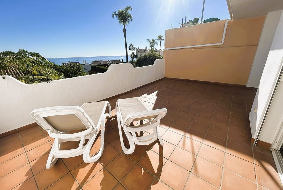 The terrace to the front of the apartment can be accessed from the living room and the main bedroom. This is a beautiful, open sunny terrace that enjoys views over the gardens and to the Mediterranean Sea.