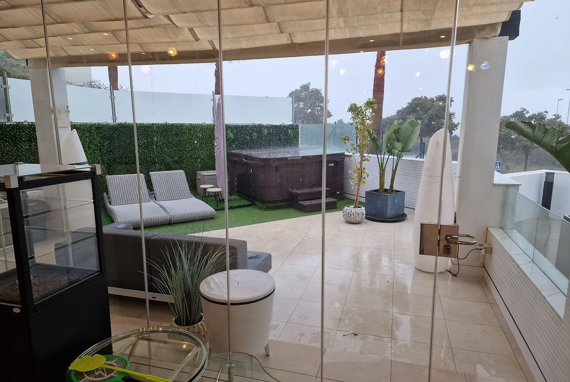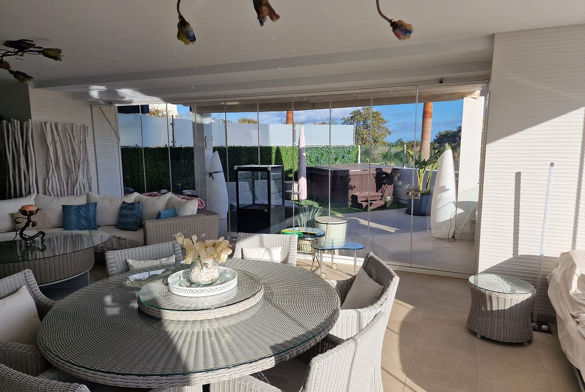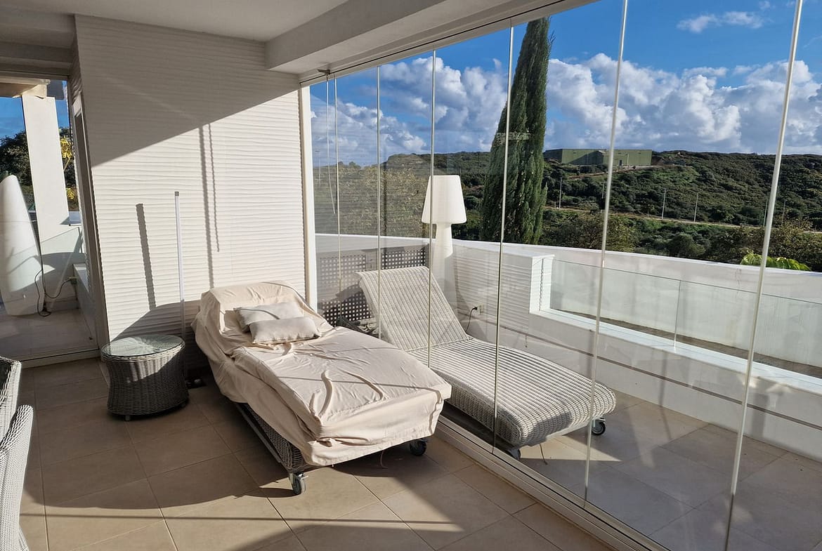 This beautiful 2 bedroom, ground floor apartment has the most amazing 122m terracing with wonderful panoramic views and is located within the gated, 5 star estate of Finca Cortesin. Newly finished in 2017 everything is ultra modern and pure perfection. From the open plan kitchen and underfloor heating in the bathrooms to the domotics system and stylish decor. This apartment has 2 large bedrooms, both with an ensuite bathroom. Both bedrooms lead on to terraces with the second bedroom boasting a private garden area as well. The main terrace is partially enclosed with glass curtains and has four separate seating areas, plus a Jacuzzi. There is a third terrace which runs the length of the apartment from which you can enjoy the stunning west facing views while watching the sun set over the surrounding hills..The panoramic views of the coast and Finca Cortesin golf are simply beautiful and the tranquility is second to none. This property is being sold fully furnished with 2 underground garage spaces and a storage room.