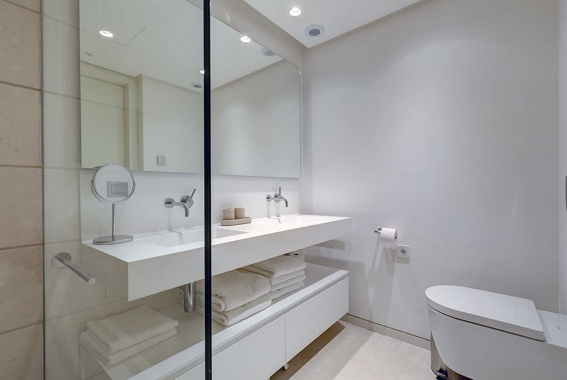 The apartment features two beautifully appointed bedrooms and two luxurious bathrooms, both equipped with walk-in showers and underfloor heating. The master suite is a private haven, enjoying direct access to the expansive terrace and complemented by an elegant en-suite bathroom. A second bedroom and guest bathroom provide equally refined accommodation for family or visitors.