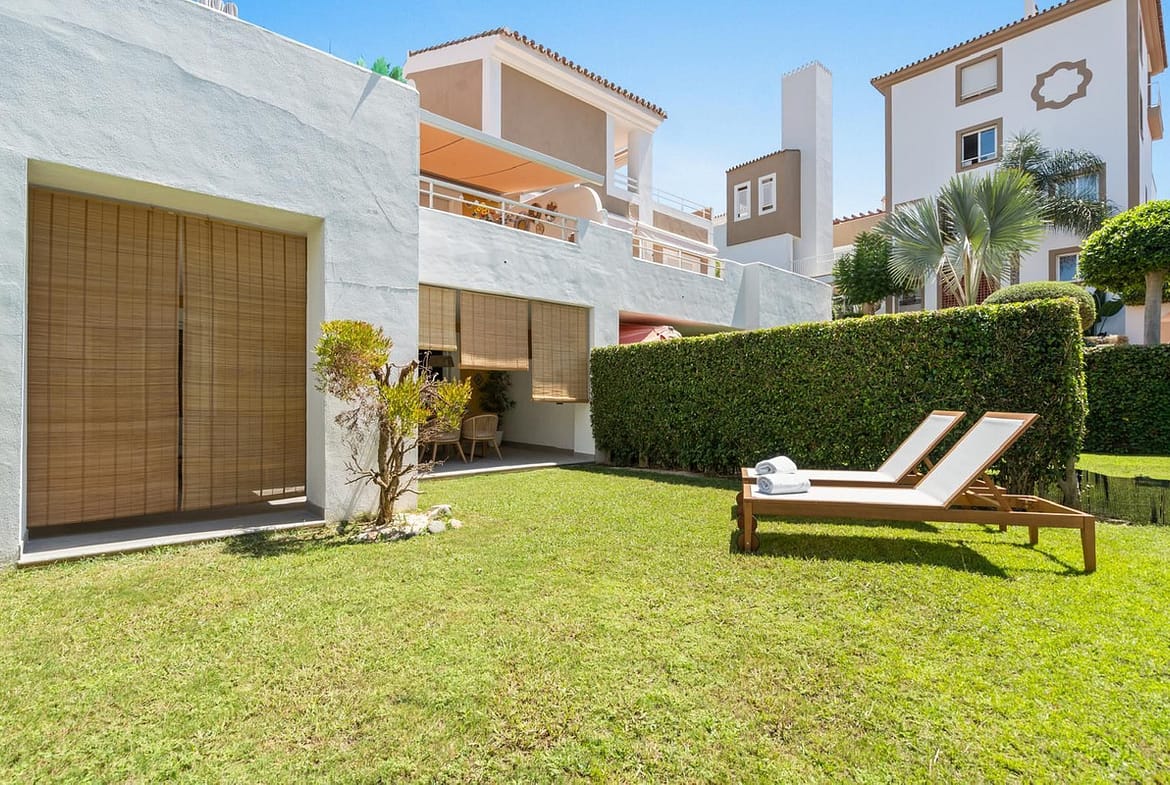 Stylishly refurbished ground floor apartment with a private garden in Cortijo del Mar. Closed development with 24 hours security, pool and pool restaurant. Walking distance to various amenities. Tourist licence in place. Great rental investment. Garage space and storage are included in the price.West facing so you can enjoy the afternoon sun.