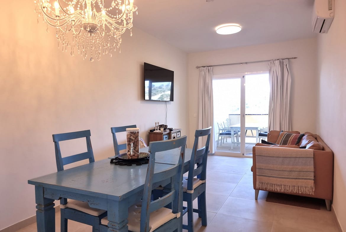 Inside, the apartment offers two bright bedrooms, including a master with an en-suite bathroom, two modern bathrooms, a fully equipped kitchen, and a light-filled living and dining area that opens onto a private terrace with panoramic views.