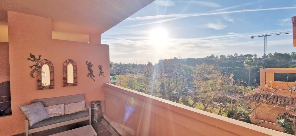 Lovely 2 bed 2 bath apartment located in a highly desirable area and only 5 minutes walk from the beach! This property is situated on an elevated ground floor and benefits from overlooking the gorgeous and very well maintained comunal gardens. The property features 2 large bedrooms with a master being en-suite and a second bathroom, both of which are a good size. There’s a a large and bright living room and a fully fitted open plan kitchen and off the living room you have a large South facing terrace which receives all day sun. The complex itself is very well maintained and has lovely green areas and large communal swimming pool. The beach is 5 minutes walk and there are many bars, shops, restaurants and a pharmacy within a 3 minute walk making the location of this property unbeatable!
