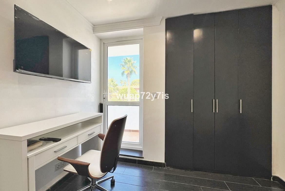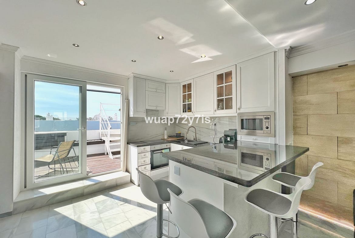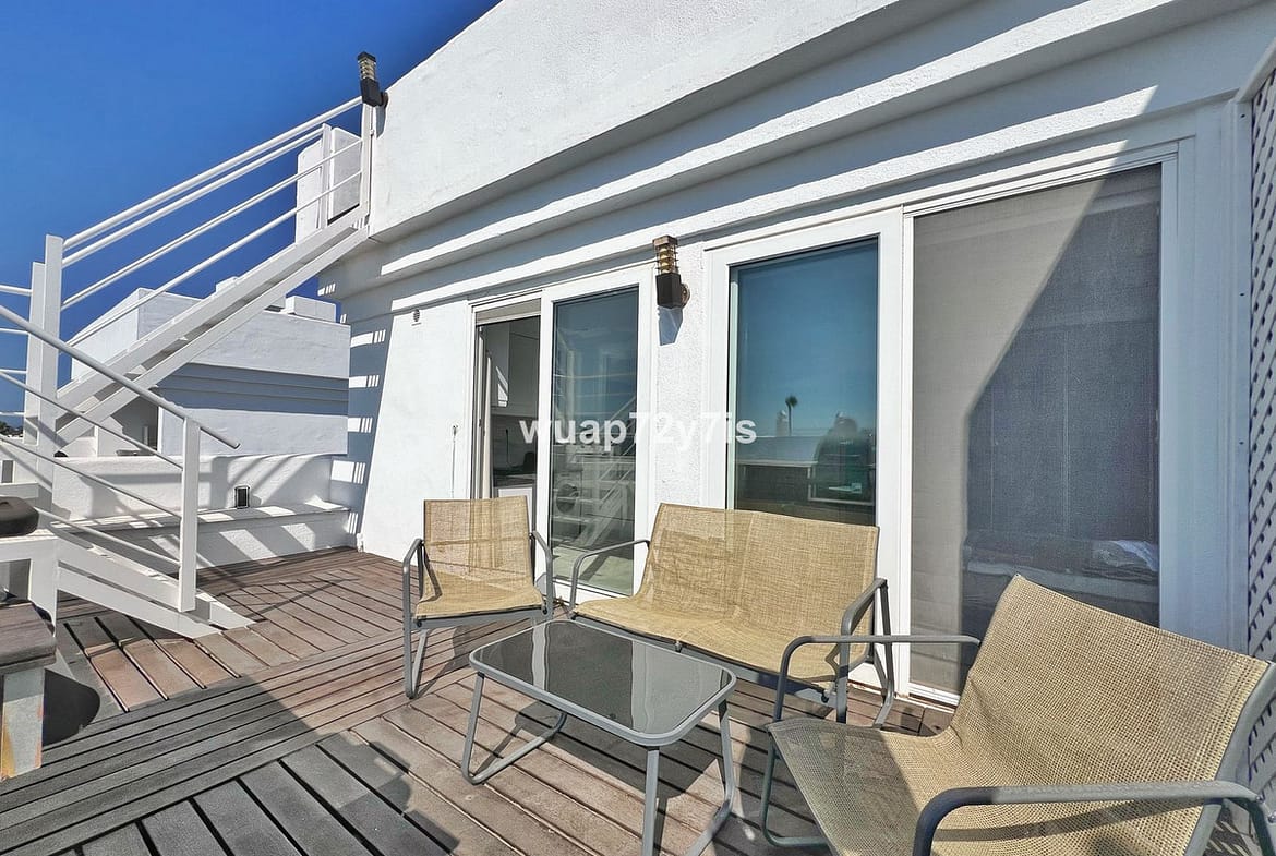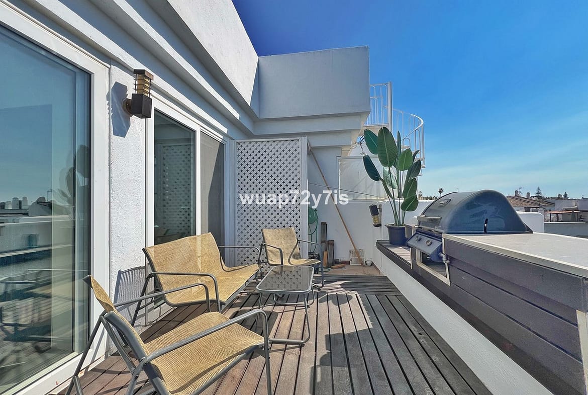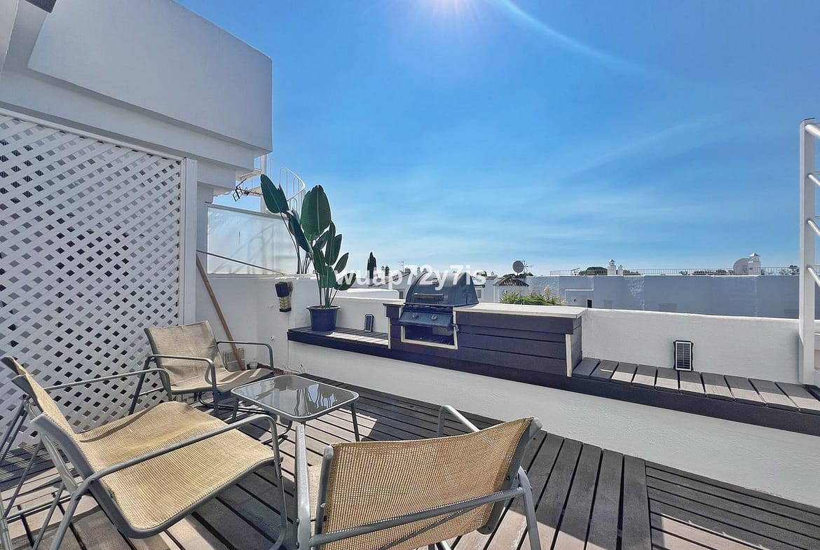 This beautifully renovated penthouse is located in the sought-after Sun Gardens urbanization in Estepona East. The community offers a swimming pool and permits short-term rentals, making it an excellent investment as well as a wonderful home. Upon entering, you are welcomed by an entrance hall with access to a guest toilet. To the right, there is a bright open-plan living room with a fully equipped kitchen. From the living area, you step out onto a spacious terrace with a barbecue area — perfect for dining and entertaining. From this terrace, a staircase leads you up to the private rooftop terrace, where you can relax in the jacuzzi, enjoy the additional barbecue space, and take in breathtaking panoramic views of La Concha mountain and the Mediterranean Sea.